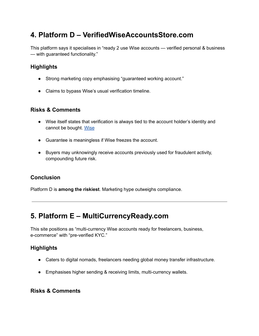 4. Platform D – VerifiedWiseAccountsStore.com This platform says it specialises in “ready 2 use Wise accounts — verified personal & business — with guaranteed functionality.” Highlights ● Strong marketing copy emphasising “guaranteed working account.” ● Claims to bypass Wise’s usual verification timeline. Risks & Comments ● Wise itself states that verification is always tied to the account holder’s identity and cannot be bought. Wise ● Guarantee is meaningless if Wise freezes the account. ● Buyers may unknowingly receive accounts previously used for fraudulent activity, compounding future risk. Conclusion Platform D is among the riskiest. Marketing hype outweighs compliance. 5. Platform E – MultiCurrencyReady.com This site positions as “multi-currency Wise accounts ready for freelancers, business, e-commerce” with “pre-verified KYC.” Highlights ● Caters to digital nomads, freelancers needing global money transfer infrastructure. ● Emphasises higher sending & receiving limits, multi-currency wallets. Risks & Comments