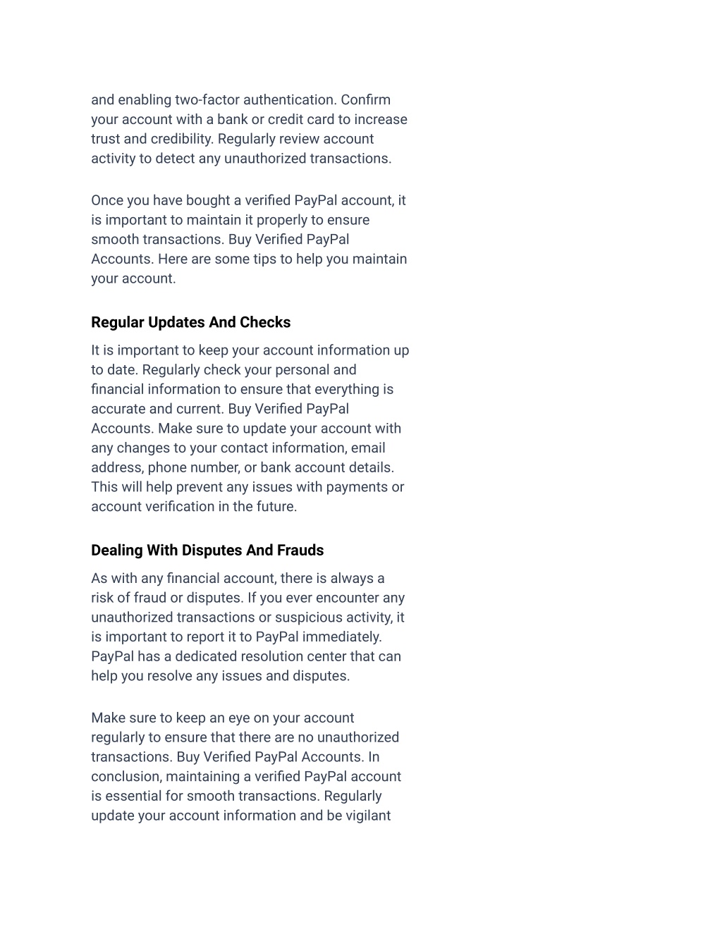 and enabling two-factor authentication. Confirm your account with a bank or credit card to increase trust and credibility. Regularly review account activity to detect any unauthorized transactions. Once you have bought a verified PayPal account, it is important to maintain it properly to ensure smooth transactions. Buy Verified PayPal Accounts. Here are some tips to help you maintain your account. Regular Updates And Checks It is important to keep your account information up to date. Regularly check your personal and financial information to ensure that everything is accurate and current. Buy Verified PayPal Accounts. Make sure to update your account with any changes to your contact information, email address, phone number, or bank account details. This will help prevent any issues with payments or account verification in the future. Dealing With Disputes And Frauds As with any financial account, there is always a risk of fraud or disputes. If you ever encounter any unauthorized transactions or suspicious activity, it is important to report it to PayPal immediately. PayPal has a dedicated resolution center that can help you resolve any issues and disputes. Make sure to keep an eye on your account regularly to ensure that there are no unauthorized transactions. Buy Verified PayPal Accounts. In conclusion, maintaining a verified PayPal account is essential for smooth transactions. Regularly update your account information and be vigilant