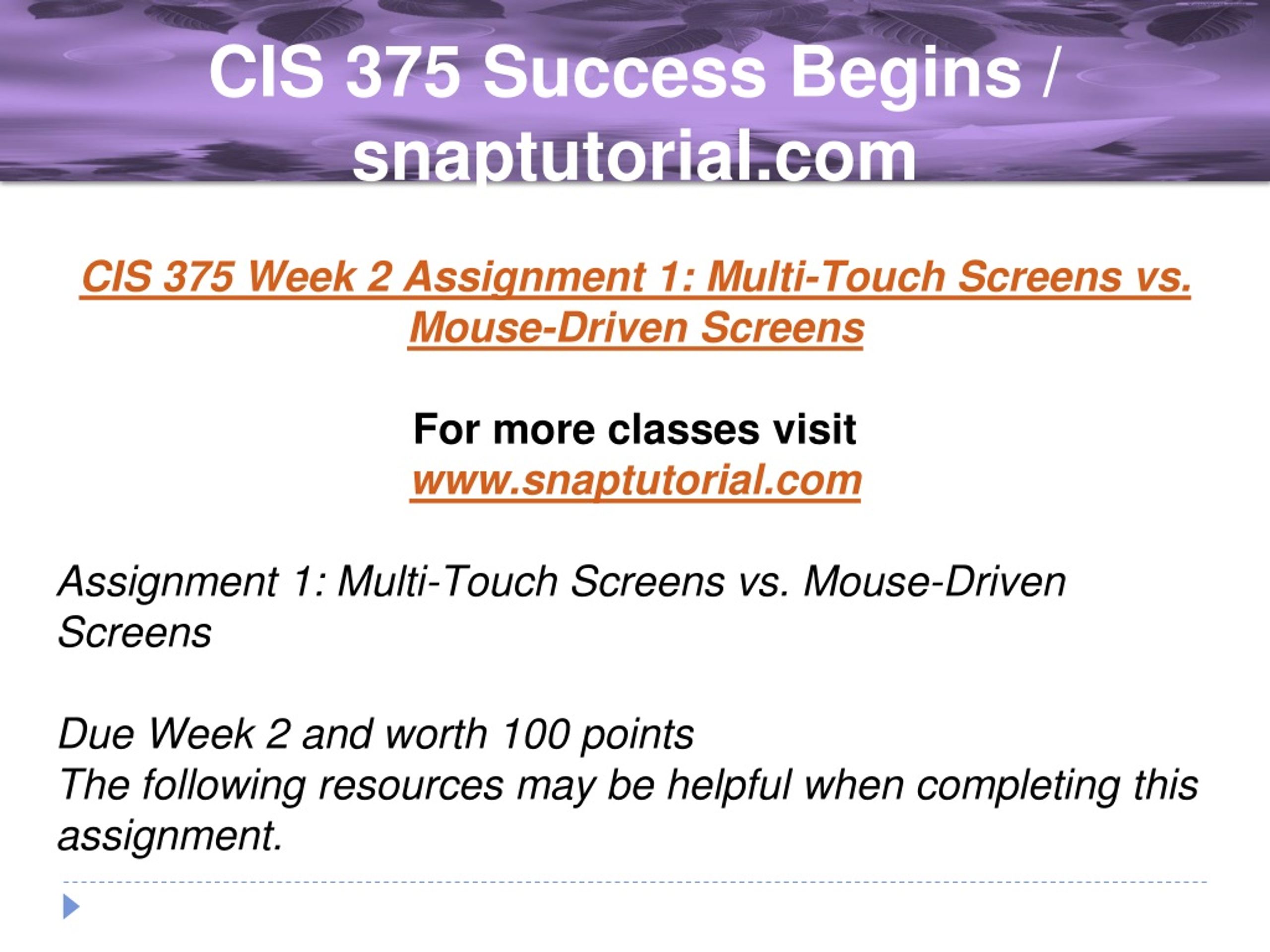 CIS 375 Success Begins / snaptutorial.com CIS 375 Week 2 Assignment 1: Multi-Touch Screens vs. Mouse-Driven Screens For more classes visit www.snaptutorial.com Assignment 1: Multi-Touch Screens vs. Mouse-Driven Screens Due Week 2 and worth 100 points The following resources may be helpful when completing this assignment.