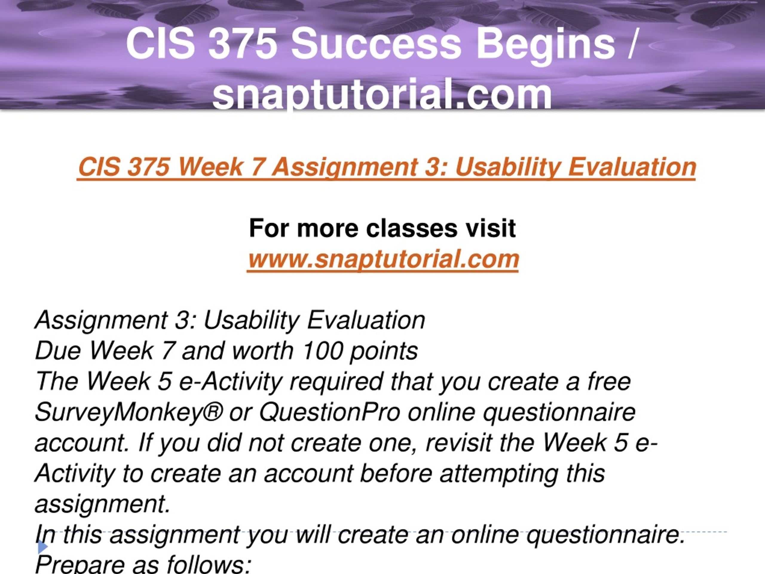 CIS 375 Success Begins / snaptutorial.com CIS 375 Week 7 Assignment 3: Usability Evaluation For more classes visit www.snaptutorial.com Assignment 3: Usability Evaluation Due Week 7 and worth 100 points The Week 5 e-Activity required that you create a free SurveyMonkey® or QuestionPro online questionnaire account. If you did not create one, revisit the Week 5 e-Activity to create an account before attempting this assignment. In this assignment you will create an online questionnaire. Prepare as follows: