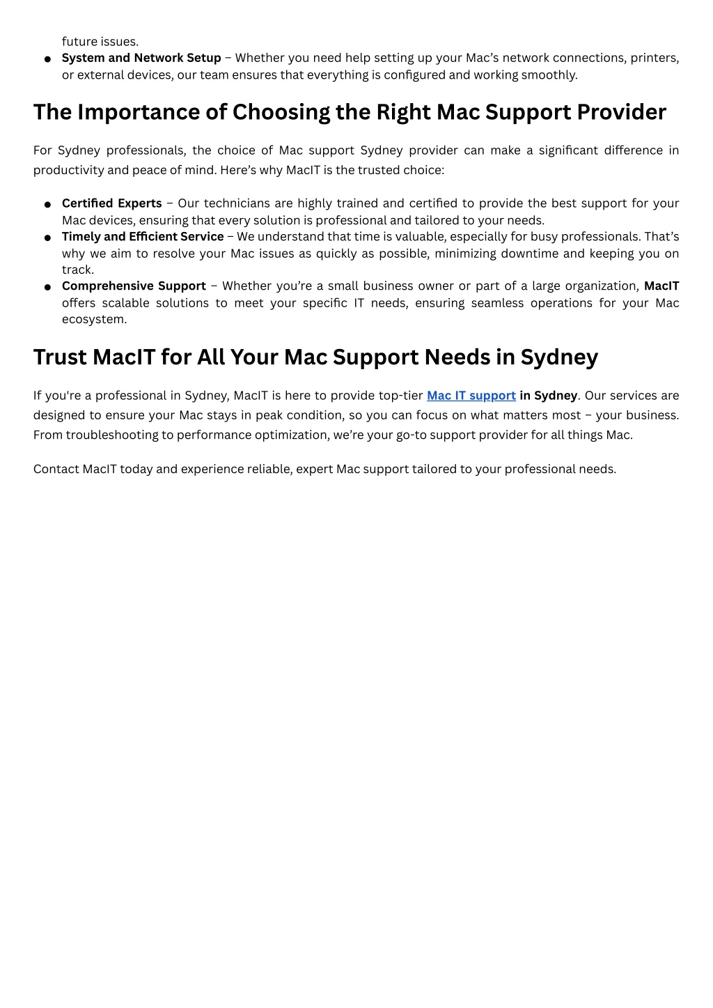 future issues. System and Network Setup – Whether you need help setting up your Mac’s network connections, printers, or external devices, our team ensures that everything is configured and working smoothly. The Importance of Choosing the Right Mac Support Provider For Sydney professionals, the choice of Mac support Sydney provider can make a significant difference in productivity and peace of mind. Here’s why MacIT is the trusted choice: Certified Experts – Our technicians are highly trained and certified to provide the best support for your Mac devices, ensuring that every solution is professional and tailored to your needs. Timely and Efficient Service – We understand that time is valuable, especially for busy professionals. That’s why we aim to resolve your Mac issues as quickly as possible, minimizing downtime and keeping you on track. Comprehensive Support – Whether you’re a small business owner or part of a large organization, MacIT offers scalable solutions to meet your specific IT needs, ensuring seamless operations for your Mac ecosystem. Trust MacIT for All Your Mac Support Needs in Sydney If you're a professional in Sydney, MacIT is here to provide top-tier Mac IT support in Sydney. Our services are designed to ensure your Mac stays in peak condition, so you can focus on what matters most – your business. From troubleshooting to performance optimization, we’re your go-to support provider for all things Mac. Contact MacIT today and experience reliable, expert Mac support tailored to your professional needs.