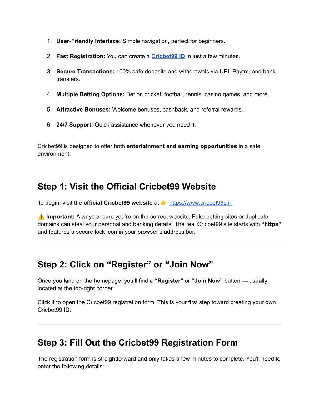 1. User-Friendly Interface: Simple navigation, perfect for beginners. 2. Fast Registration: You can create a Cricbet99 ID in just a few minutes. 3. Secure Transactions: 100% safe deposits and withdrawals via UPI, Paytm, and bank transfers. 4. Multiple Betting Options: Bet on cricket, football, tennis, casino games, and more. 5. Attractive Bonuses: Welcome bonuses, cashback, and referral rewards. 6. 24/7 Support: Quick assistance whenever you need it. Cricbet99 is designed to offer both entertainment and earning opportunities in a safe environment. Step 1: Visit the Official Cricbet99 Website To begin, visit the official Cricbet99 website at ?https://www.cricbet99s.in ⚠Important: Always ensure you’re on the correct website. Fake betting sites or duplicate domains can steal your personal and banking details. The real Cricbet99 site starts with “https” and features a secure lock icon in your browser’s address bar. Step 2: Click on “Register” or “Join Now” Once you land on the homepage, you’ll find a “Register” or “Join Now” button — usually located at the top-right corner. Click it to open the Cricbet99 registration form. This is your first step toward creating your own Cricbet99 ID. Step 3: Fill Out the Cricbet99 Registration Form The registration form is straightforward and only takes a few minutes to complete. You’ll need to enter the following details: