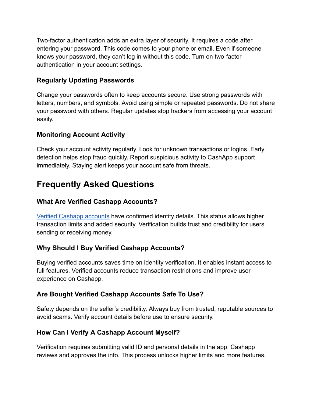 Two-factor authentication adds an extra layer of security. It requires a code after entering your password. This code comes to your phone or email. Even if someone knows your password, they can’t log in without this code. Turn on two-factor authentication in your account settings. Regularly Updating Passwords Change your passwords often to keep accounts secure. Use strong passwords with letters, numbers, and symbols. Avoid using simple or repeated passwords. Do not share your password with others. Regular updates stop hackers from accessing your account easily. Monitoring Account Activity Check your account activity regularly. Look for unknown transactions or logins. Early detection helps stop fraud quickly. Report suspicious activity to CashApp support immediately. Staying alert keeps your account safe from threats. Frequently Asked Questions What Are Verified Cashapp Accounts? Verified Cashapp accounts have confirmed identity details. This status allows higher transaction limits and added security. Verification builds trust and credibility for users sending or receiving money. Why Should I Buy Verified Cashapp Accounts? Buying verified accounts saves time on identity verification. It enables instant access to full features. Verified accounts reduce transaction restrictions and improve user experience on Cashapp. Are Bought Verified Cashapp Accounts Safe To Use? Safety depends on the seller’s credibility. Always buy from trusted, reputable sources to avoid scams. Verify account details before use to ensure security. How Can I Verify A Cashapp Account Myself? Verification requires submitting valid ID and personal details in the app. Cashapp reviews and approves the info. This process unlocks higher limits and more features.