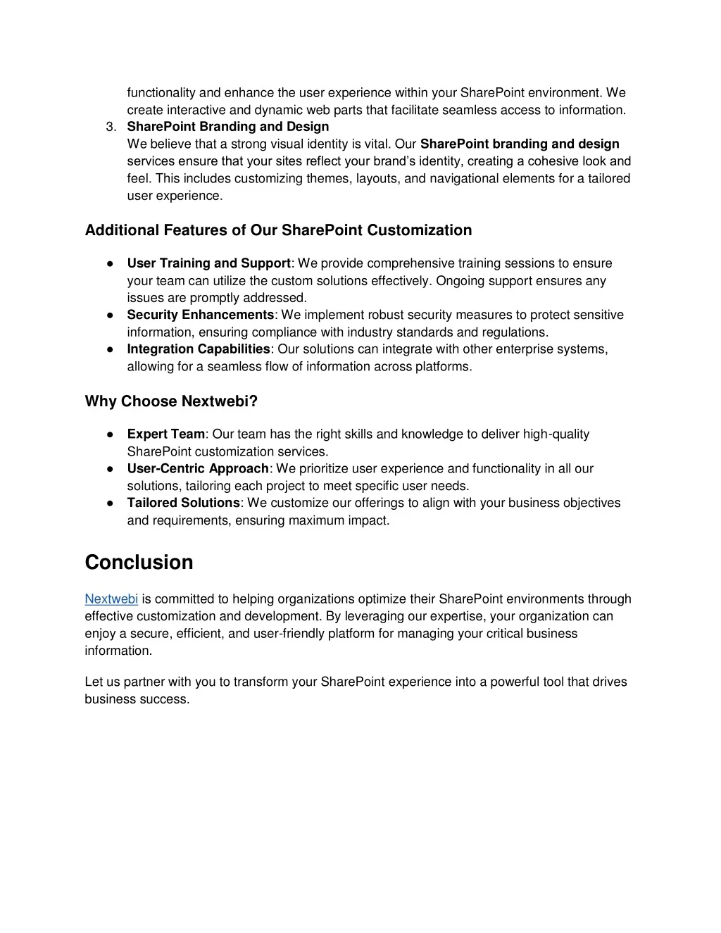 functionality and enhance the user experience within your SharePoint environment. We create interactive and dynamic web parts that facilitate seamless access to information. 3. SharePoint Branding and Design We believe that a strong visual identity is vital. Our SharePoint branding and design services ensure that your sites reflect your brand’s identity, creating a cohesive look and feel. This includes customizing themes, layouts, and navigational elements for a tailored user experience. Additional Features of Our SharePoint Customization ●User Training and Support: We provide comprehensive training sessions to ensure your team can utilize the custom solutions effectively. Ongoing support ensures any issues are promptly addressed. ●Security Enhancements: We implement robust security measures to protect sensitive information, ensuring compliance with industry standards and regulations. ●Integration Capabilities: Our solutions can integrate with other enterprise systems, allowing for a seamless flow of information across platforms. Why Choose Nextwebi? ●Expert Team: Our team has the right skills and knowledge to deliver high-quality SharePoint customization services. ●User-Centric Approach: We prioritize user experience and functionality in all our solutions, tailoring each project to meet specific user needs. ●Tailored Solutions: We customize our offerings to align with your business objectives and requirements, ensuring maximum impact. Conclusion Nextwebi is committed to helping organizations optimize their SharePoint environments through effective customization and development. By leveraging our expertise, your organization can enjoy a secure, efficient, and user-friendly platform for managing your critical business information. Let us partner with you to transform your SharePoint experience into a powerful tool that drives business success.