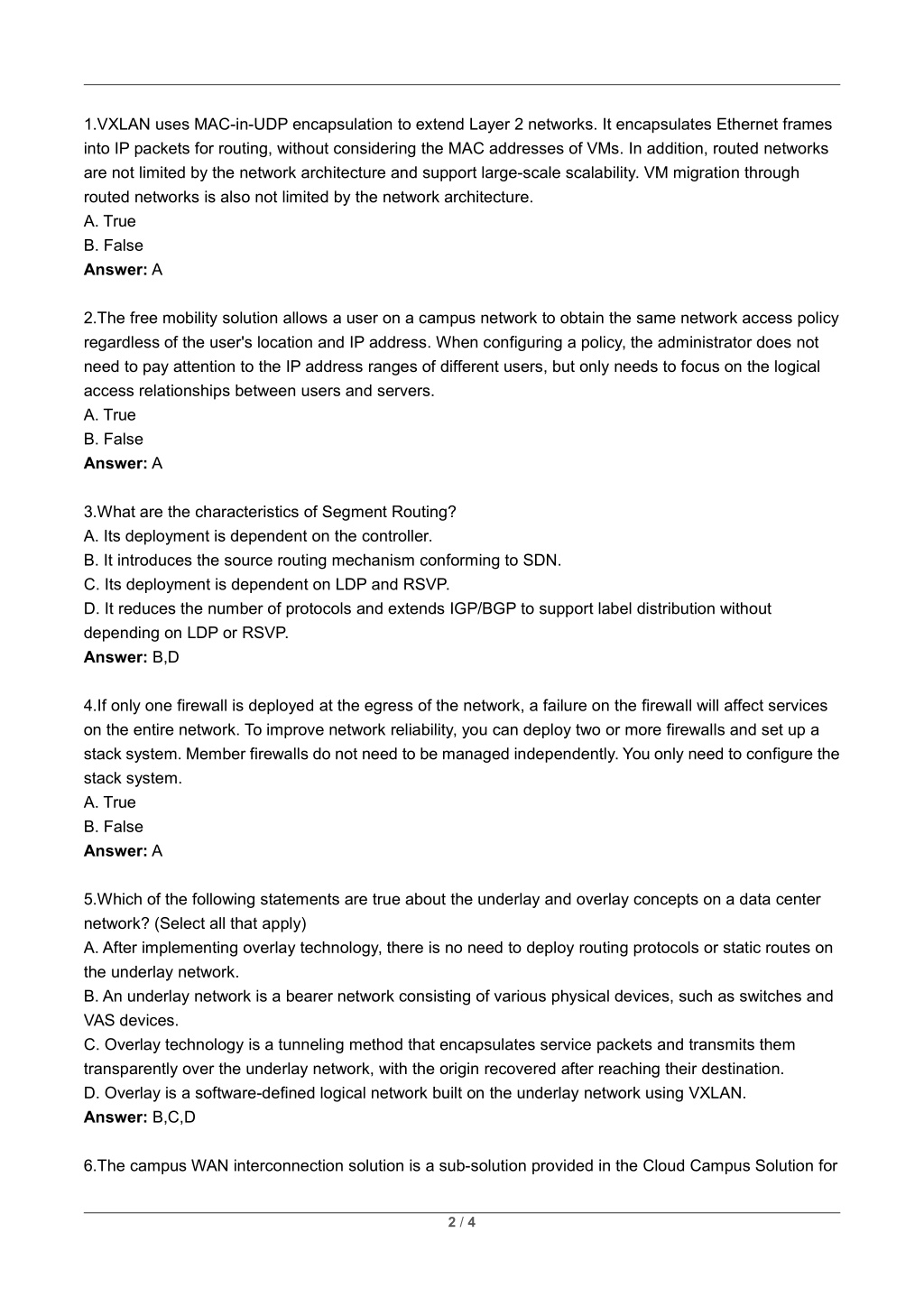 1.VXLAN uses MAC-in-UDP encapsulation to extend Layer 2 networks. It encapsulates Ethernet frames into IP packets for routing, without considering the MAC addresses of VMs. In addition, routed networks are not limited by the network architecture and support large-scale scalability. VM migration through routed networks is also not limited by the network architecture. A. True B. False Answer: A 2.The free mobility solution allows a user on a campus network to obtain the same network access policy regardless of the user's location and IP address. When configuring a policy, the administrator does not need to pay attention to the IP address ranges of different users, but only needs to focus on the logical access relationships between users and servers. A. True B. False Answer: A 3.What are the characteristics of Segment Routing? A. Its deployment is dependent on the controller. B. It introduces the source routing mechanism conforming to SDN. C. Its deployment is dependent on LDP and RSVP. D. It reduces the number of protocols and extends IGP/BGP to support label distribution without depending on LDP or RSVP. Answer: B,D 4.If only one firewall is deployed at the egress of the network, a failure on the firewall will affect services on the entire network. To improve network reliability, you can deploy two or more firewalls and set up a stack system. Member firewalls do not need to be managed independently. You only need to configure the stack system. A. True B. False Answer: A 5.Which of the following statements are true about the underlay and overlay concepts on a data center network? (Select all that apply) A. After implementing overlay technology, there is no need to deploy routing protocols or static routes on the underlay network. B. An underlay network is a bearer network consisting of various physical devices, such as switches and VAS devices. C. Overlay technology is a tunneling method that encapsulates service packets and transmits them transparently over the underlay network, with the origin recovered after reaching their destination. D. Overlay is a software-defined logical network built on the underlay network using VXLAN. Answer: B,C,D 6.The campus WAN interconnection solution is a sub-solution provided in the Cloud Campus Solution for 2 / 4