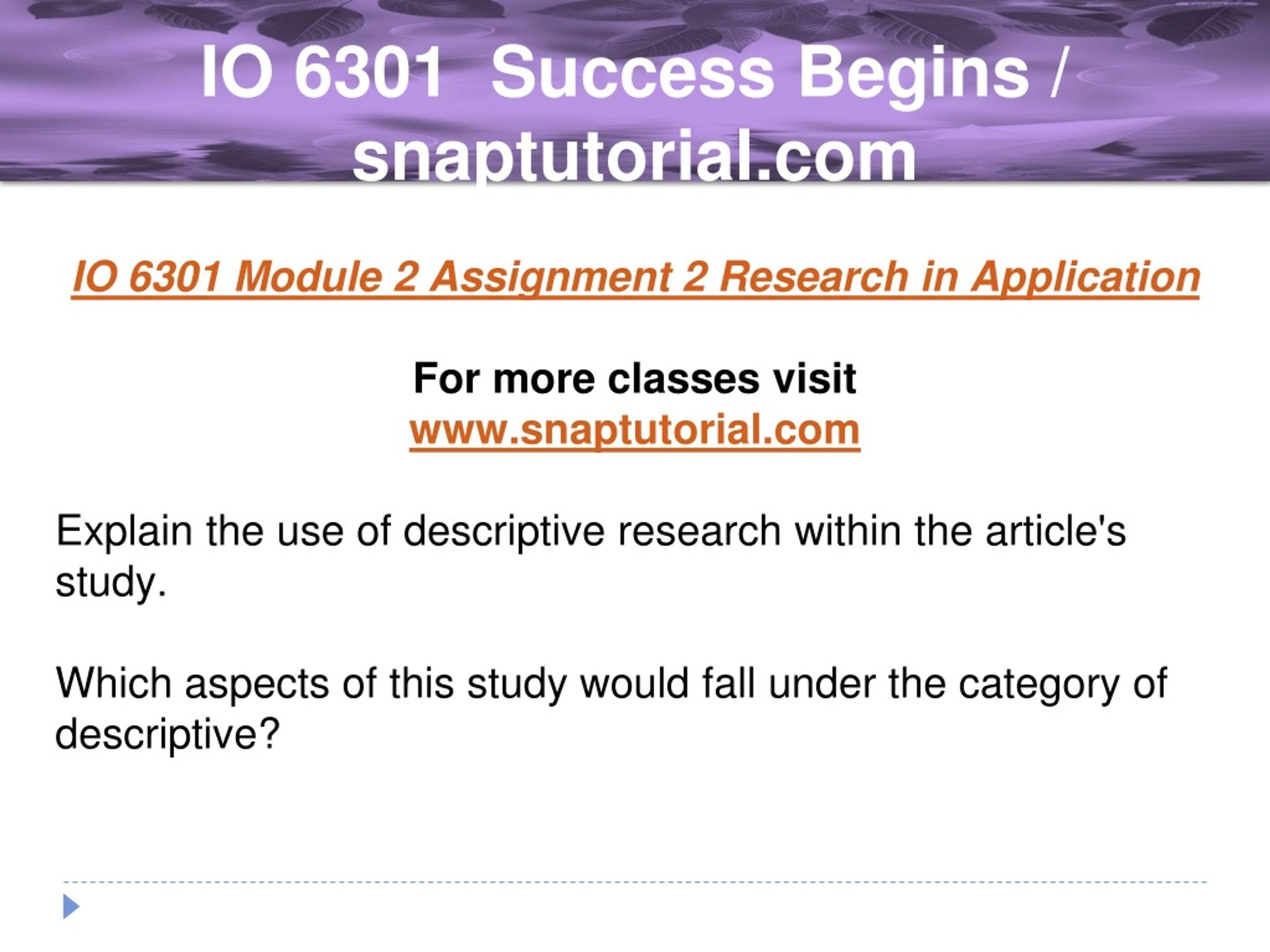 IO 6301 Success Begins / snaptutorial.com IO 6301 Module 2 Assignment 2 Research in Application For more classes visit www.snaptutorial.com Explain the use of descriptive research within the article's study. Which aspects of this study would fall under the category of descriptive?