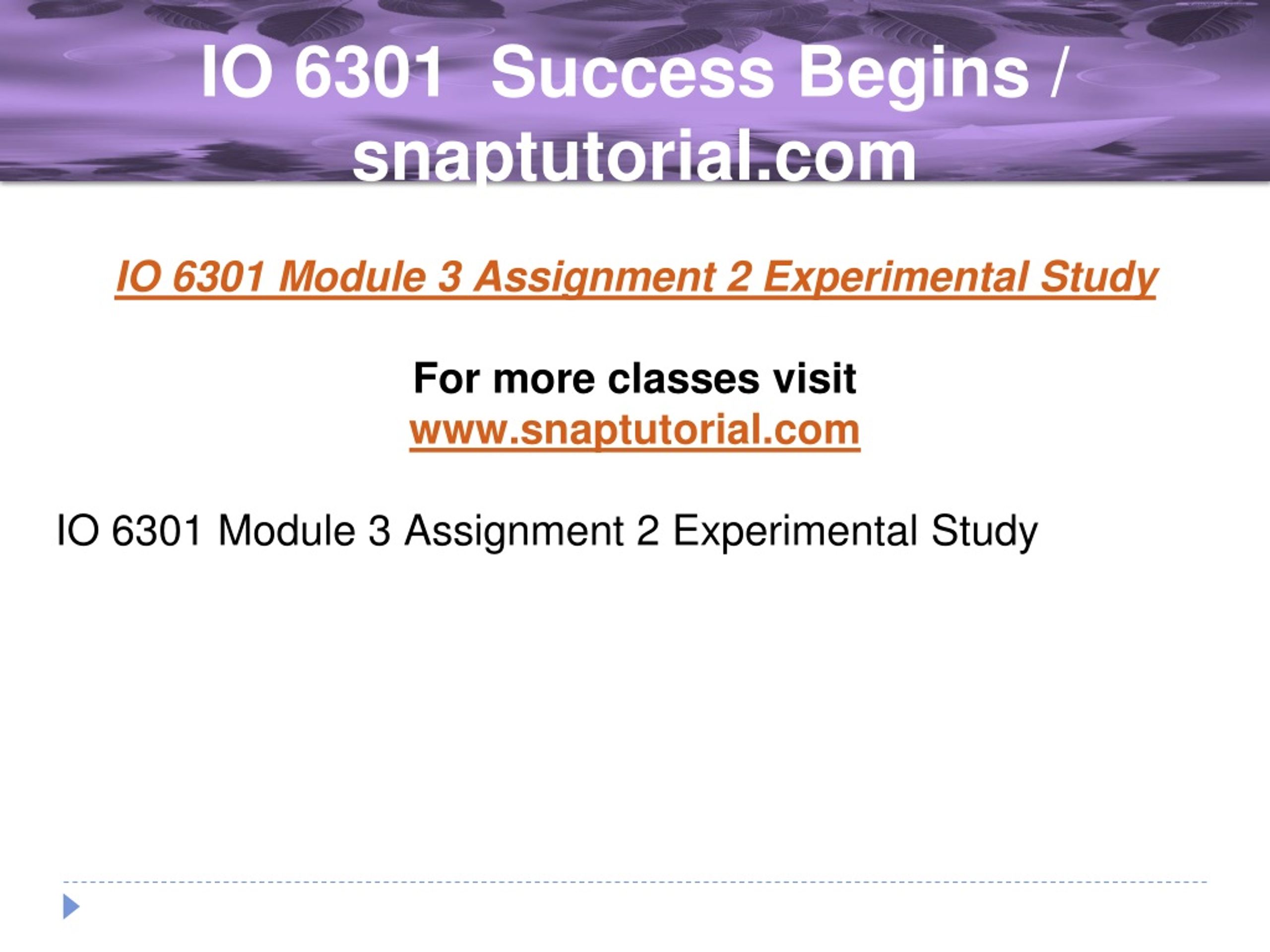 IO 6301 Success Begins / snaptutorial.com IO 6301 Module 3 Assignment 2 Experimental Study For more classes visit www.snaptutorial.com IO 6301 Module 3 Assignment 2 Experimental Study