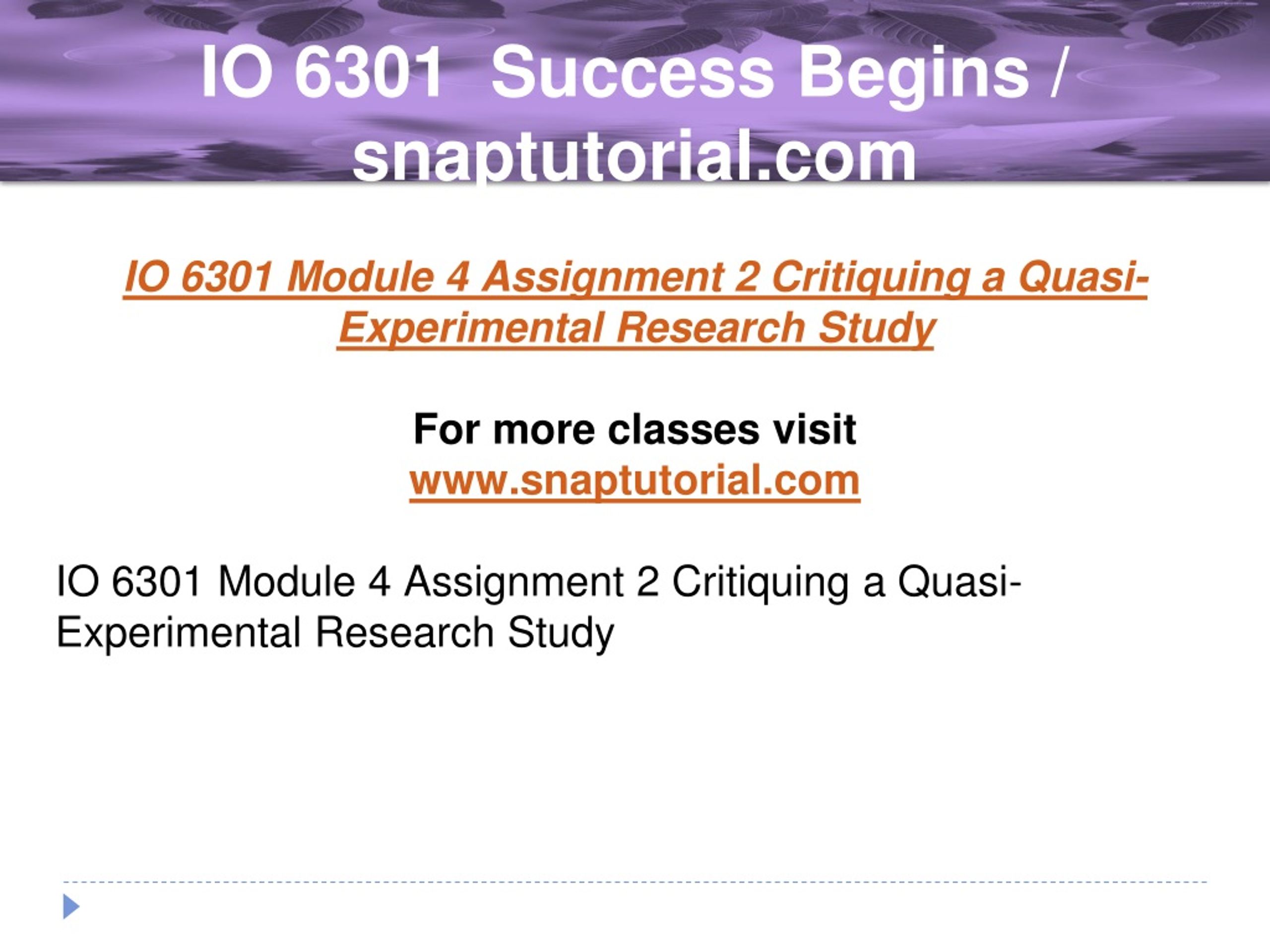 IO 6301 Success Begins / snaptutorial.com IO 6301 Module 4 Assignment 2 Critiquing a Quasi-Experimental Research Study For more classes visit www.snaptutorial.com IO 6301 Module 4 Assignment 2 Critiquing a Quasi-Experimental Research Study