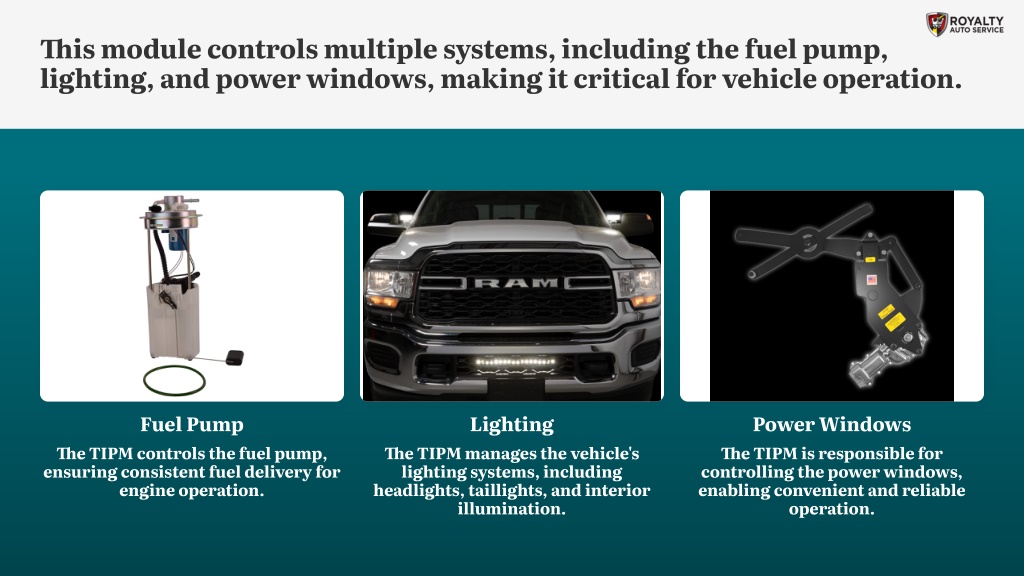 This module controls multiple systems, including the fuel pump, lighting, and power windows, making it critical for vehicle operation. Fuel Pump Lighting Power Windows The TIPM controls the fuel pump, ensuring consistent fuel delivery for engine operation. The TIPM manages the vehicle's lighting systems, including headlights, taillights, and interior illumination. The TIPM is responsible for controlling the power windows, enabling convenient and reliable operation.