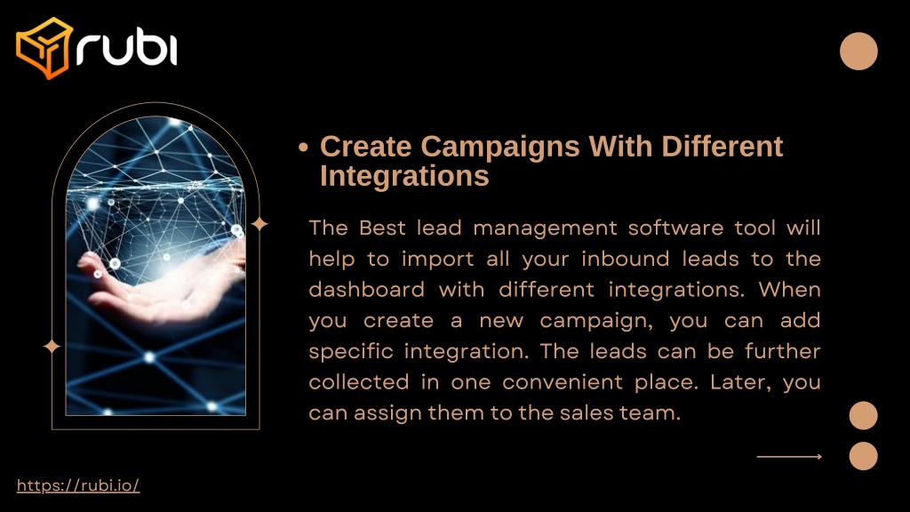 Create Campaigns With Different Integrations The Best lead management software tool will help to import all your inbound leads to the dashboard with different integrations. When you create a new campaign, you can add specific integration. The leads can be further collected in one convenient place. Later, you can assign them to the sales team. https://rubi.io/