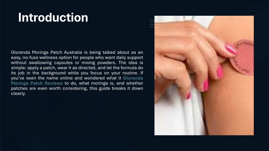 2. What Is Glorenda Moringa Patch? • Glorenda Moringa Patch is marketed as a topical patch-style supplement that features moringa as the hero ingredient. Moringa(oftencalledthe“drumstick tree”) is widelyknownin wellness circles because compounds, vitamins, and antioxidants. The patch format is promoted as a more convenient alternative to tablets or powders—especiallyfor peoplewhodislikeswallowingpills. it contains natural plant • In most patch products, the concept is that you place the patch on your skin and wear it for a set number of hours. During that time, the patch may help deliver ingredients through the skin (or provide localized support depending on the product design). Many brands also pair moringa with other supportive ingredients that match goals like energy, metabolism,stress,or generalwellness. • Because product formulas can vary between batches and sellers, the smartest approach is to check the exact ingredient list and directions on the label you are buying in Australia.
