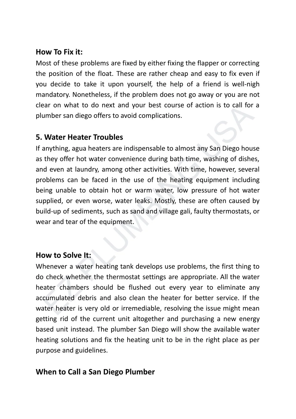 How To Fix it: Most of these problems are fixed by either fixing the flapper or correcting the position of the float. These are rather cheap and easy to fix even if you decide to take it upon yourself, the help of a friend is well-nigh mandatory. Nonetheless, if the problem does not go away or you are not clear on what to do next and your best course of action is to call for a plumber san diego offers to avoid complications. EZ PLUMBING USA getting rid of the current unit altogether and purchasing a new energy based unit instead. The plumber San Diego will show the available water heating solutions and fix the heating unit to be in the right place as per purpose and guidelines. 5. Water Heater Troubles If anything, agua heaters are indispensable to almost any San Diego house as they offer hot water convenience during bath time, washing of dishes, and even at laundry, among other activities. With time, however, several problems can be faced in the use of the heating equipment including being unable to obtain hot or warm water, low pressure of hot water supplied, or even worse, water leaks. Mostly, these are often caused by build-up of sediments, such as sand and village gali, faulty thermostats, or wear and tear of the equipment. How to Solve It: Whenever a water heating tank develops use problems, the first thing to do check whether the thermostat settings are appropriate. All the water heater chambers should be flushed out every year to eliminate any accumulated debris and also clean the heater for better service. If the water heater is very old or irremediable, resolving the issue might mean When to Call a San Diego Plumber