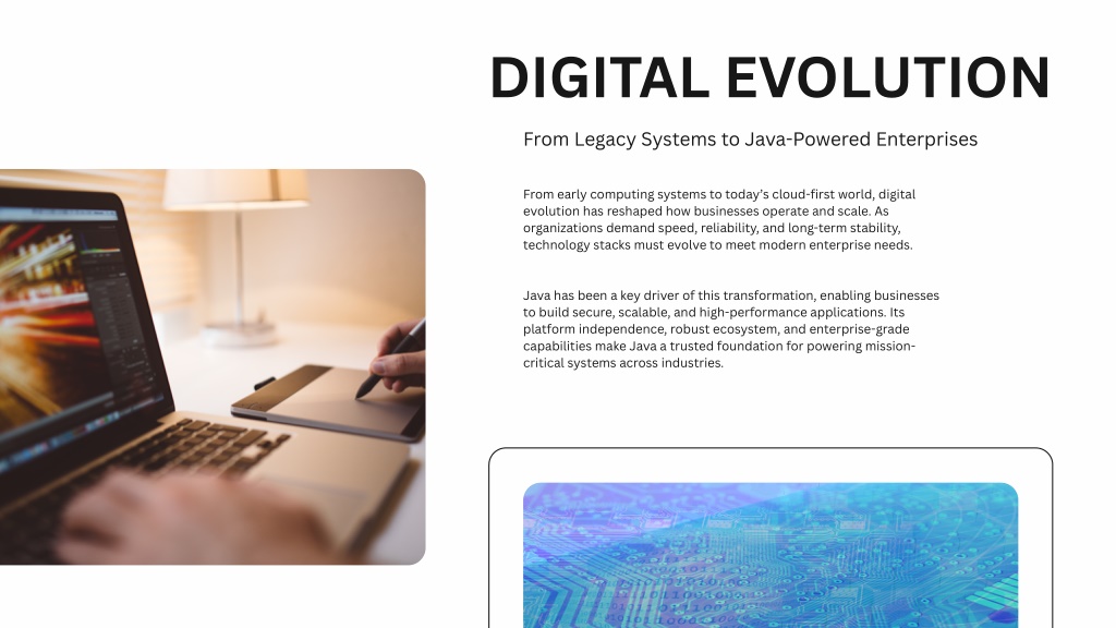 DIGITAL EVOLUTION From Legacy Systems to Java-Powered Enterprises From early computing systems to today’s cloud-first world, digital evolution has reshaped how businesses operate and scale. As organizations demand speed, reliability, and long-term stability, technology stacks must evolve to meet modern enterprise needs. Java has been a key driver of this transformation, enabling businesses to build secure, scalable, and high-performance applications. Its platform independence, robust ecosystem, and enterprise-grade capabilities make Java a trusted foundation for powering mission- critical systems across industries.