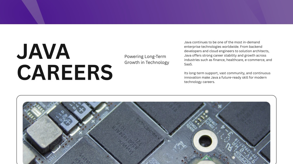 JAVA CAREERS Java continues to be one of the most in-demand enterprise technologies worldwide. From backend developers and cloud engineers to solution architects, Java offers strong career stability and growth across industries such as finance, healthcare, e-commerce, and SaaS. Powering Long-Term Growth in Technology Its long-term support, vast community, and continuous innovation make Java a future-ready skill for modern technology careers.