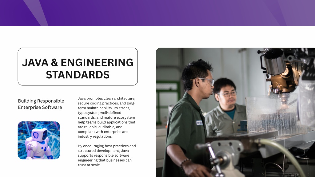 JAVA & ENGINEERING STANDARDS Java promotes clean architecture, secure coding practices, and long- term maintainability. Its strong type system, well-defined standards, and mature ecosystem help teams build applications that are reliable, auditable, and compliant with enterprise and industry regulations. Building Responsible Enterprise Software By encouraging best practices and structured development, Java supports responsible software engineering that businesses can trust at scale.