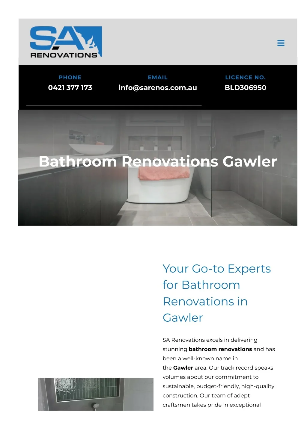 PHONE EMAIL LICENCE NO. 0421 377 173 info@sarenos.com.au BLD306950 Bathroom Renovations Gawler Your Go-to Experts for Bathroom Renovations in Gawler SA Renovations excels in delivering stunning bathroom renovations and has been a well-known name in the Gawler area. Our track record speaks volumes about our commitment to sustainable, budget-friendly, high-quality construction. Our team of adept craftsmen takes pride in exceptional