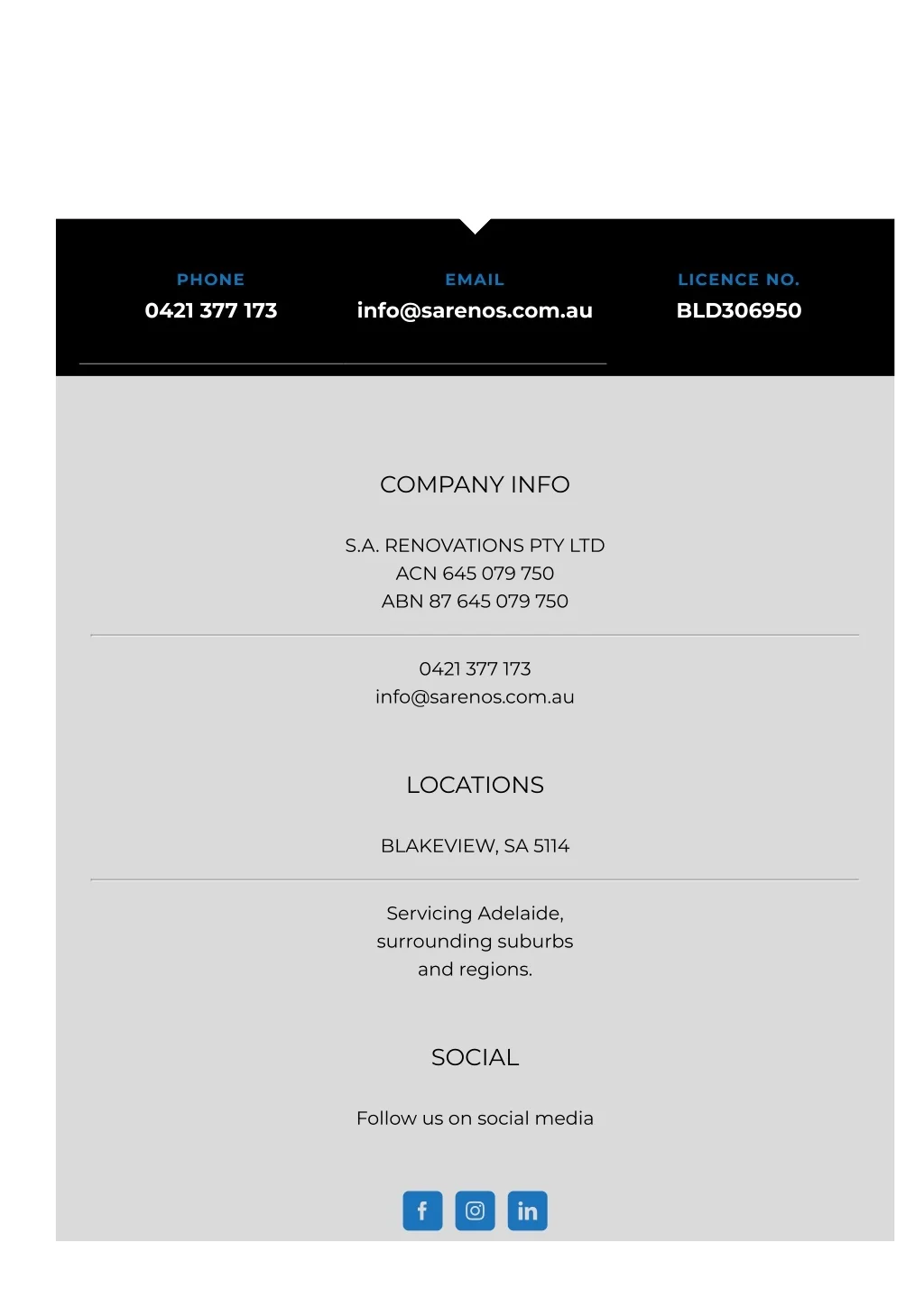 PHONE EMAIL LICENCE NO. 0421 377 173 info@sarenos.com.au BLD306950 COMPANY INFO S.A. RENOVATIONS PTY LTD ACN 645 079 750 ABN 87 645 079 750 0421 377 173 info@sarenos.com.au LOCATIONS BLAKEVIEW, SA 5114 Servicing Adelaide, surrounding suburbs and regions. SOCIAL Follow us on social media