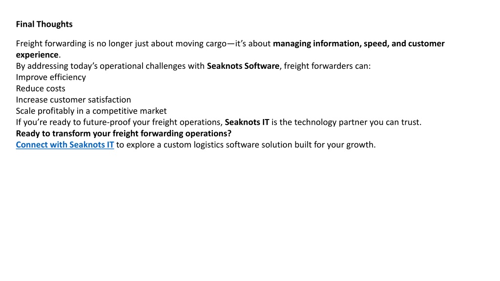 Final Thoughts Freight forwarding is no longer just about moving cargo—it’s about managing information, speed, and customer experience. By addressing today’s operational challenges with Seaknots Software, freight forwarders can: Improve efficiency Reduce costs Increase customer satisfaction Scale profitably in a competitive market If you’re ready to future-proof your freight operations, Seaknots IT is the technology partner you can trust. Ready to transform your freight forwarding operations? Connect with Seaknots IT to explore a custom logistics software solution built for your growth.