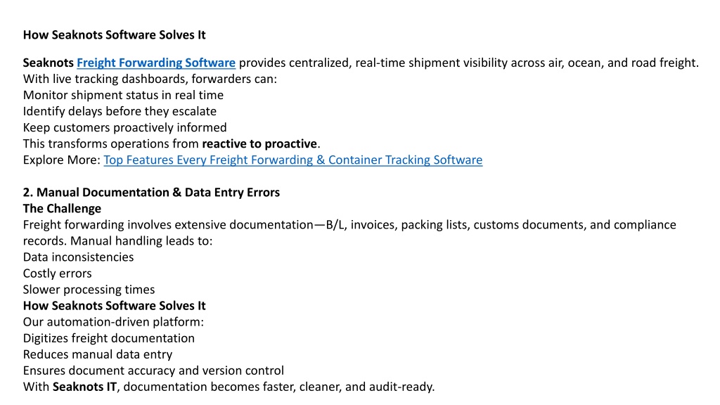 How Seaknots Software Solves It Seaknots Freight Forwarding Software provides centralized, real-time shipment visibility across air, ocean, and road freight. With live tracking dashboards, forwarders can: Monitor shipment status in real time Identify delays before they escalate Keep customers proactively informed This transforms operations from reactive to proactive. Explore More: Top Features Every Freight Forwarding & Container Tracking Software 2. Manual Documentation & Data Entry Errors The Challenge Freight forwarding involves extensive documentation—B/L, invoices, packing lists, customs documents, and compliance records. Manual handling leads to: Data inconsistencies Costly errors Slower processing times How Seaknots Software Solves It Our automation-driven platform: Digitizes freight documentation Reduces manual data entry Ensures document accuracy and version control With Seaknots IT, documentation becomes faster, cleaner, and audit-ready.