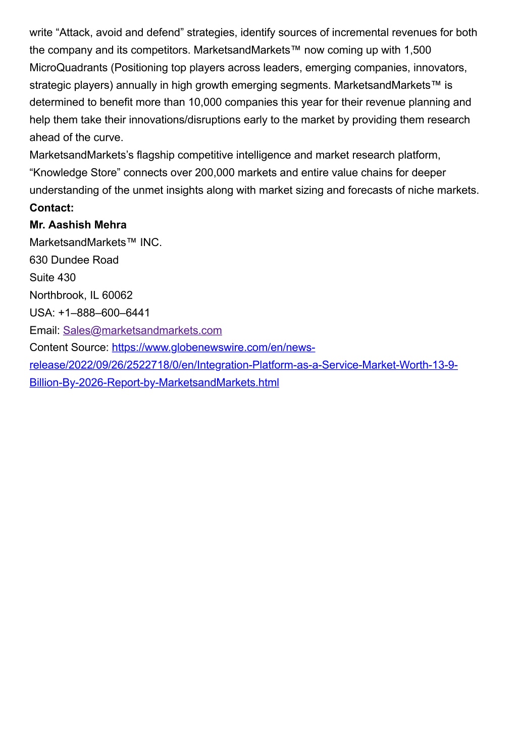 write “Attack, avoid and defend” strategies, identify sources of incremental revenues for both the company and its competitors. MarketsandMarkets™ now coming up with 1,500 MicroQuadrants (Positioning top players across leaders, emerging companies, innovators, strategic players) annually in high growth emerging segments. MarketsandMarkets™ is determined to benefit more than 10,000 companies this year for their revenue planning and help them take their innovations/disruptions early to the market by providing them research ahead of the curve. MarketsandMarkets’s flagship competitive intelligence and market research platform, “Knowledge Store” connects over 200,000 markets and entire value chains for deeper understanding of the unmet insights along with market sizing and forecasts of niche markets. Contact: Mr. Aashish Mehra MarketsandMarkets™ INC. 630 Dundee Road Suite 430 Northbrook, IL 60062 USA: +1–888–600–6441 Email: Sales@marketsandmarkets.com Content Source: https://www.globenewswire.com/en/news- release/2022/09/26/2522718/0/en/Integration-Platform-as-a-Service-Market-Worth-13-9- Billion-By-2026-Report-by-MarketsandMarkets.html