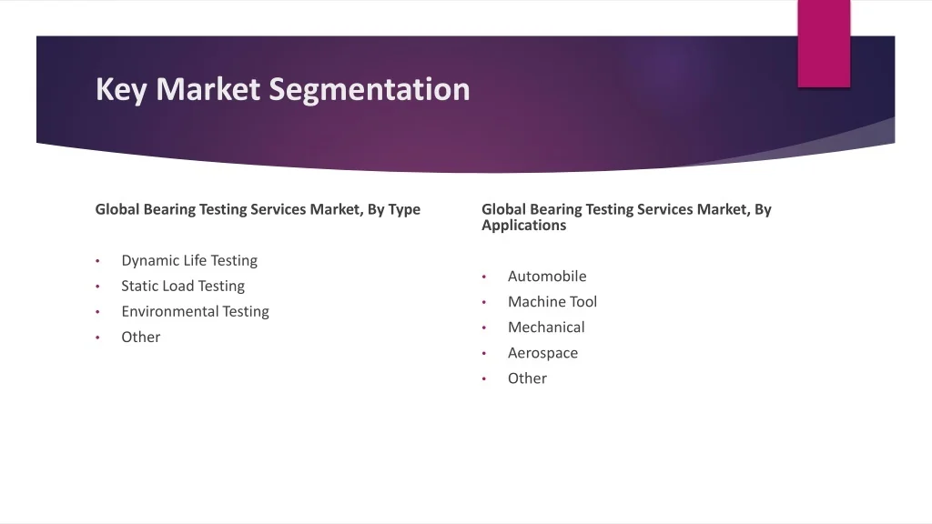 Key Market Segmentation Global Bearing Testing Services Market, By Type • Dynamic Life Testing • Static Load Testing • Environmental Testing • Other Global Bearing Testing Services Market, By Applications • Automobile • Machine Tool • Mechanical • Aerospace • Other
