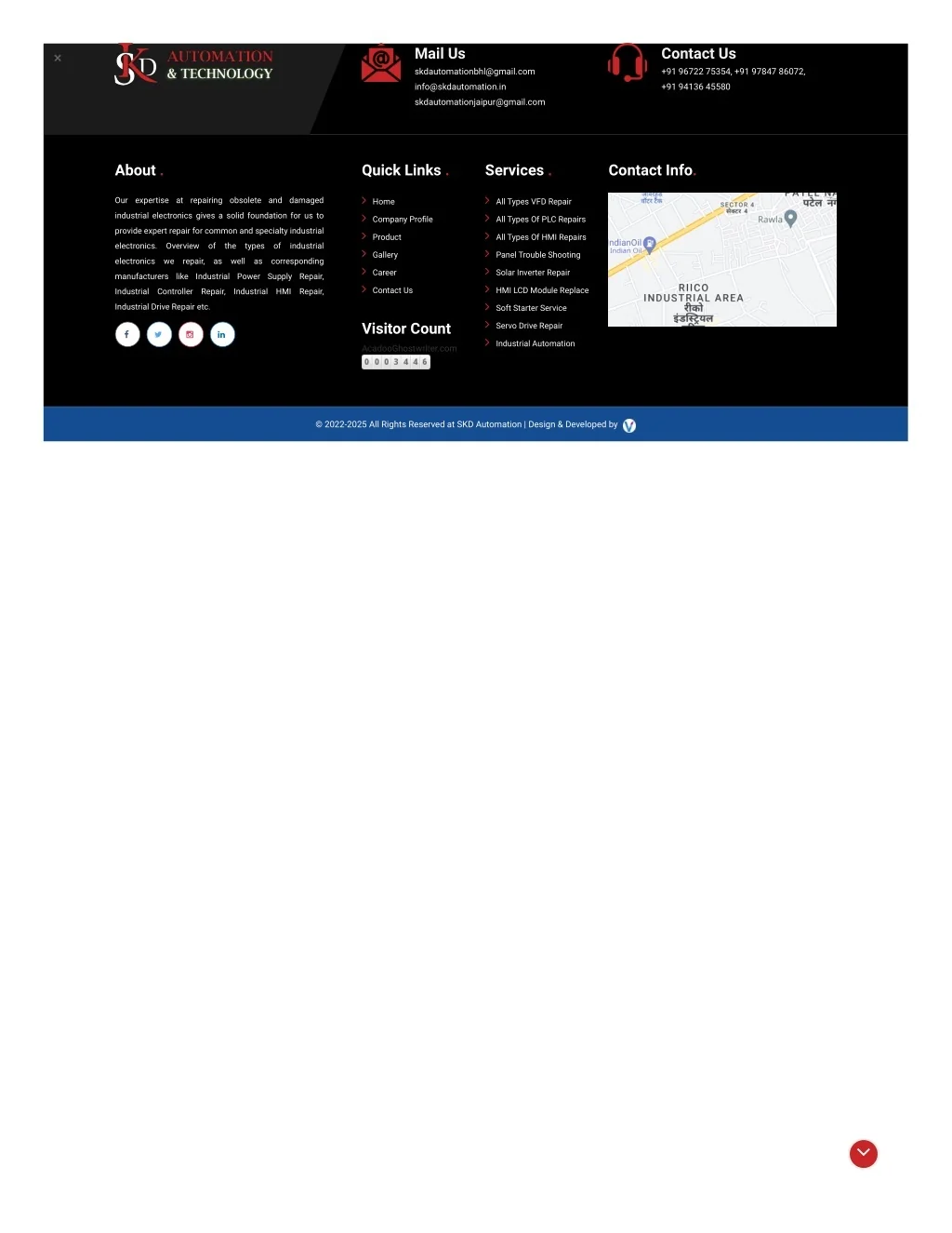 Mail Us skdautomationbhl@gmail.com Contact Us +91 96722 75354, +91 97847 86072, × info@skdautomation.in +91 94136 45580 skdautomationjaipur@gmail.com About . Quick Links . Services . Contact Info. Our expertise at repairing obsolete and damaged Home All Types VFD Repair industrial electronics gives a solid foundation for us to Company Pro?le All Types Of PLC Repairs provide expert repair for common and specialty industrial Product All Types Of HMI Repairs electronics. Overview of the types of industrial Gallery Panel Trouble Shooting electronics we repair, as well as corresponding Career Solar Inverter Repair manufacturers like Industrial Power Supply Repair, Contact Us HMI LCD Module Replace Industrial Controller Repair, Industrial HMI Repair, Industrial Drive Repair etc. Soft Starter Service Visitor Count Servo Drive Repair Industrial Automation AcadooGhostwriter.com © 2022-2025 All Rights Reserved at SKD Automation | Design & Developed by