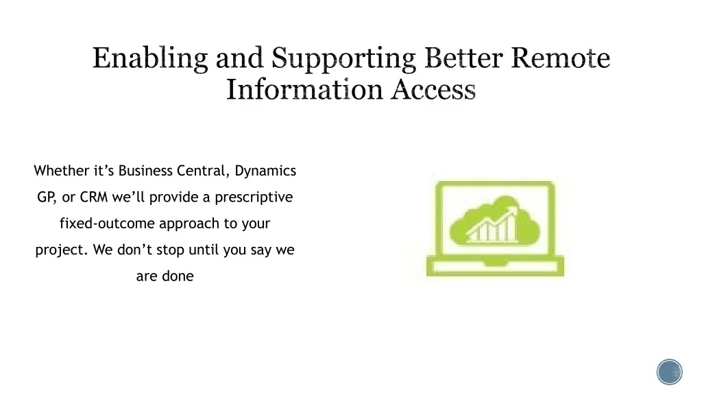 Enabling and Supporting Better Remote Information Access Whether it’s Business Central, Dynamics GP, or CRM we’ll provide a prescriptive fixed-outcome approach to your project. We don’t stop until you say we are done