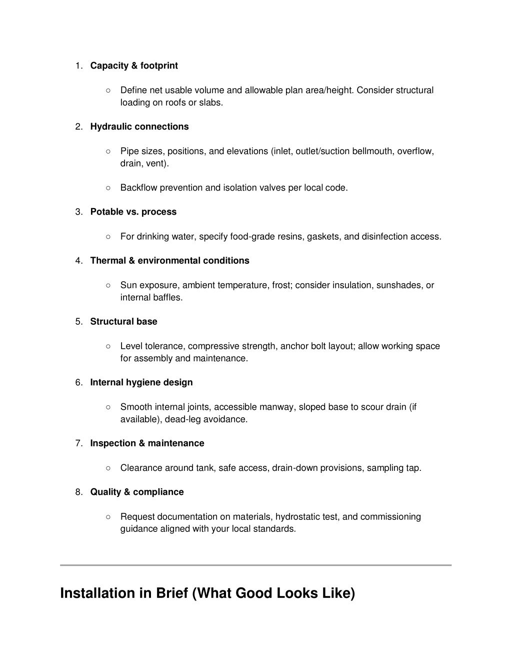 1. Capacity & footprint ○ Define net usable volume and allowable plan area/height. Consider structural loading on roofs or slabs. 2. Hydraulic connections ○ Pipe sizes, positions, and elevations (inlet, outlet/suction bellmouth, overflow, drain, vent). ○ Backflow prevention and isolation valves per local code. 3. Potable vs. process ○ For drinking water, specify food-grade resins, gaskets, and disinfection access. 4. Thermal & environmental conditions ○ Sun exposure, ambient temperature, frost; consider insulation, sunshades, or internal baffles. 5. Structural base ○ Level tolerance, compressive strength, anchor bolt layout; allow working space for assembly and maintenance. 6. Internal hygiene design ○ Smooth internal joints, accessible manway, sloped base to scour drain (if available), dead-leg avoidance. 7. Inspection & maintenance ○ Clearance around tank, safe access, drain-down provisions, sampling tap. 8. Quality & compliance ○ Request documentation on materials, hydrostatic test, and commissioning guidance aligned with your local standards. Installation in Brief (What Good Looks Like)