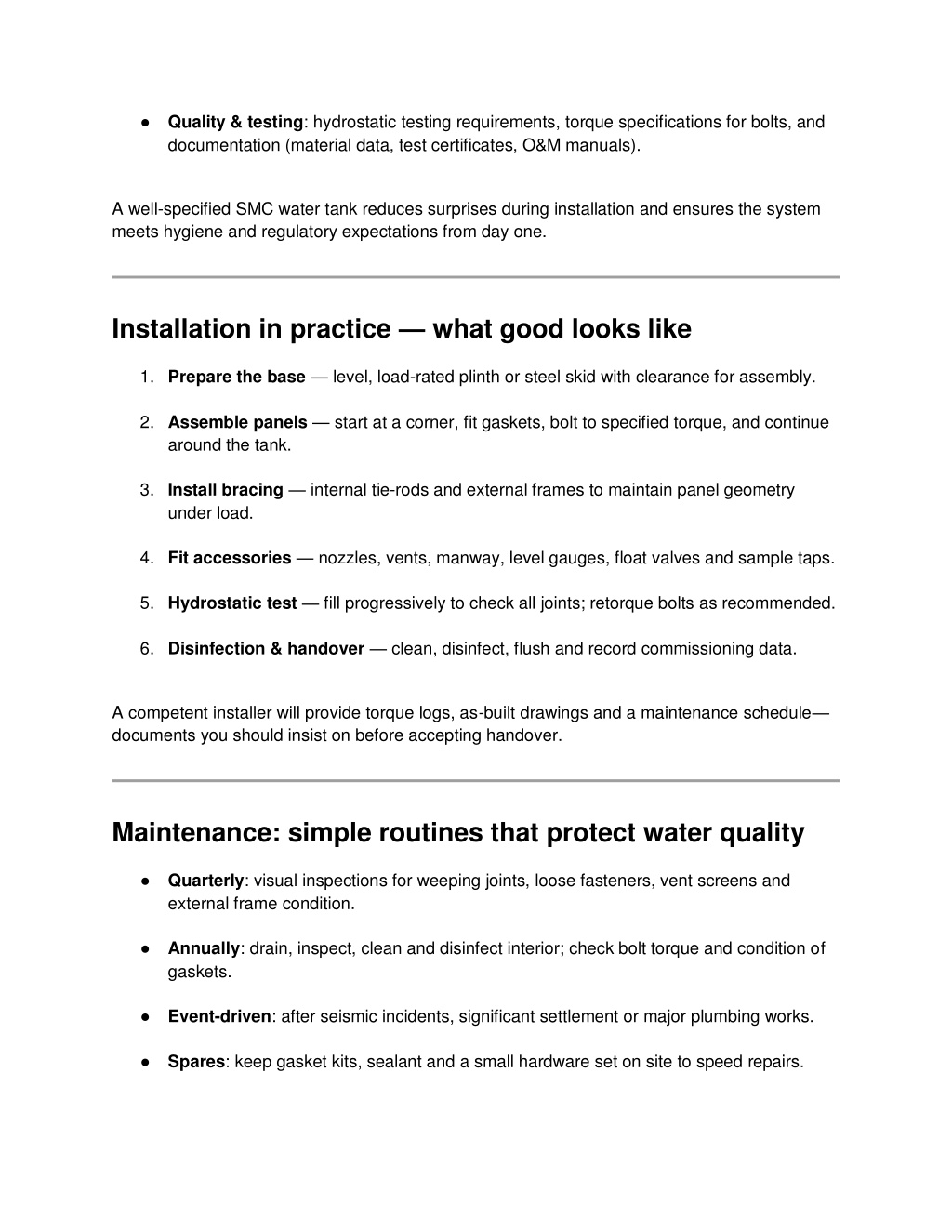 ●Quality & testing: hydrostatic testing requirements, torque specifications for bolts, and documentation (material data, test certificates, O&M manuals). A well-specified SMC water tank reduces surprises during installation and ensures the system meets hygiene and regulatory expectations from day one. Installation in practice — what good looks like 1. Prepare the base— level, load-rated plinth or steel skid with clearance for assembly. 2. Assemble panels— start at a corner, fit gaskets, bolt to specified torque, and continue around the tank. 3. Install bracing— internal tie-rods and external frames to maintain panel geometry under load. 4. Fit accessories— nozzles, vents, manway, level gauges, float valves and sample taps. 5. Hydrostatic test— fill progressively to check all joints; retorque bolts as recommended. 6. Disinfection & handover— clean, disinfect, flush and record commissioning data. A competent installer will provide torque logs, as-built drawings and a maintenance schedule— documents you should insist on before accepting handover. Maintenance: simple routines that protect water quality ●Quarterly: visual inspections for weeping joints, loose fasteners, vent screens and external frame condition. ●Annually: drain, inspect, clean and disinfect interior; check bolt torque and condition of gaskets. ●Event-driven: after seismic incidents, significant settlement or major plumbing works. ●Spares: keep gasket kits, sealant and a small hardware set on site to speed repairs.