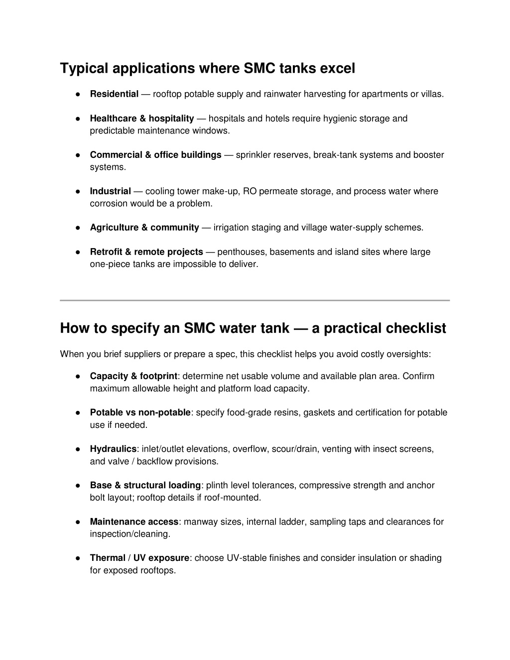 Typical applications where SMC tanks excel ●Residential— rooftop potable supply and rainwater harvesting for apartments or villas. ●Healthcare & hospitality— hospitals and hotels require hygienic storage and predictable maintenance windows. ●Commercial & office buildings— sprinkler reserves, break-tank systems and booster systems. ●Industrial— cooling tower make-up, RO permeate storage, and process water where corrosion would be a problem. ●Agriculture & community— irrigation staging and village water-supply schemes. ●Retrofit & remote projects— penthouses, basements and island sites where large one-piece tanks are impossible to deliver. How to specify an SMC water tank — a practical checklist When you brief suppliers or prepare a spec, this checklist helps you avoid costly oversights: ●Capacity & footprint: determine net usable volume and available plan area. Confirm maximum allowable height and platform load capacity. ●Potable vs non-potable: specify food-grade resins, gaskets and certification for potable use if needed. ●Hydraulics: inlet/outlet elevations, overflow, scour/drain, venting with insect screens, and valve / backflow provisions. ●Base & structural loading: plinth level tolerances, compressive strength and anchor bolt layout; rooftop details if roof-mounted. ●Maintenance access: manway sizes, internal ladder, sampling taps and clearances for inspection/cleaning. ●Thermal / UV exposure: choose UV-stable finishes and consider insulation or shading for exposed rooftops.