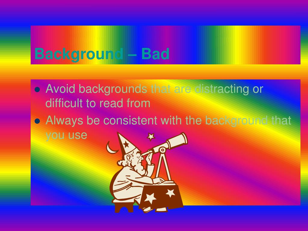 13. Background – Bad • Avoid backgrounds that are distracting or difficult to read from • Always be consistent with the background that you use