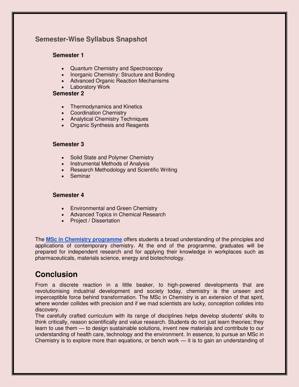 Semester-Wise Syllabus Snapshot Semester 1 Quantum Chemistry and Spectroscopy Inorganic Chemistry: Structure and Bonding Advanced Organic Reaction Mechanisms Laboratory Work Semester 2 Thermodynamics and Kinetics Coordination Chemistry Analytical Chemistry Techniques Organic Synthesis and Reagents Semester 3 Solid State and Polymer Chemistry Instrumental Methods of Analysis Research Methodology and Scientific Writing Seminar Semester 4 Environmental and Green Chemistry Advanced Topics in Chemical Research Project / Dissertation The MSc in Chemistry programme offers students a broad understanding of the principles and applications of contemporary chemistry. At the end of the programme, graduates will be prepared for independent research and for applying their knowledge in workplaces such as pharmaceuticals, materials science, energy and biotechnology. Conclusion From a discrete reaction in a little beaker, to high-powered developments that are revolutionising industrial development and society today, chemistry is the unseen and imperceptible force behind transformation. The MSc in Chemistry is an extension of that spirit, where wonder collides with precision and if we mad scientists are lucky, conception collides into discovery. The carefully crafted curriculum with its range of disciplines helps develop students' skills to think critically, reason scientifically and value research. Students do not just learn theories; they learn to use them — to design sustainable solutions, invent new materials and contribute to our understanding of health care, technology and the environment. In essence, to pursue an MSc in Chemistry is to explore more than equations, or bench work — it is to gain an understanding of