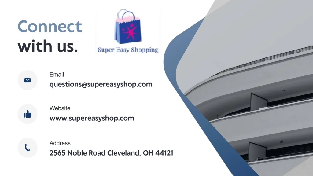 Email • Website • Address • questions@supereasyshop.com • www.supereasyshop.com • 2565 Noble Road Cleveland, OH 44121 Connect with us.