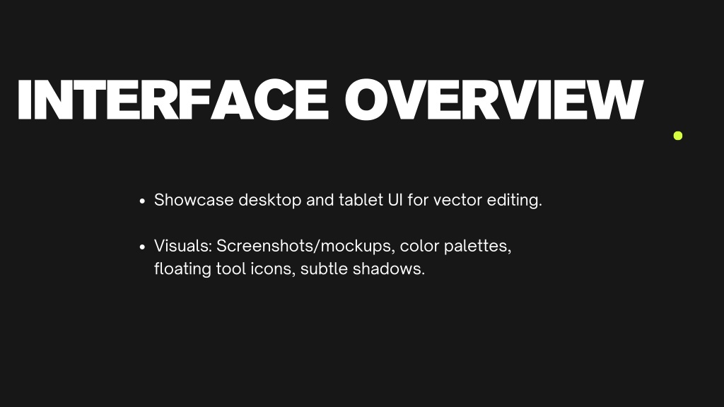 INTERFACE OVERVIEW Showcase desktop and tablet UI for vector editing. Visuals: Screenshots/mockups, color palettes, floating tool icons, subtle shadows.