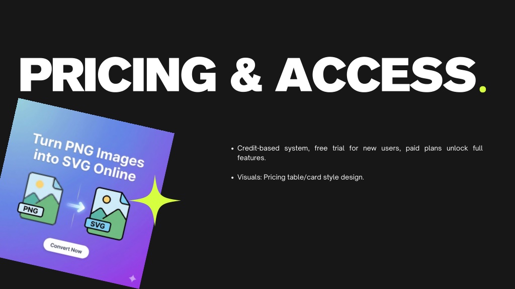 PRICING & ACCESS Credit-based system, free trial for new users, paid plans unlock full features. Visuals: Pricing table/card style design.