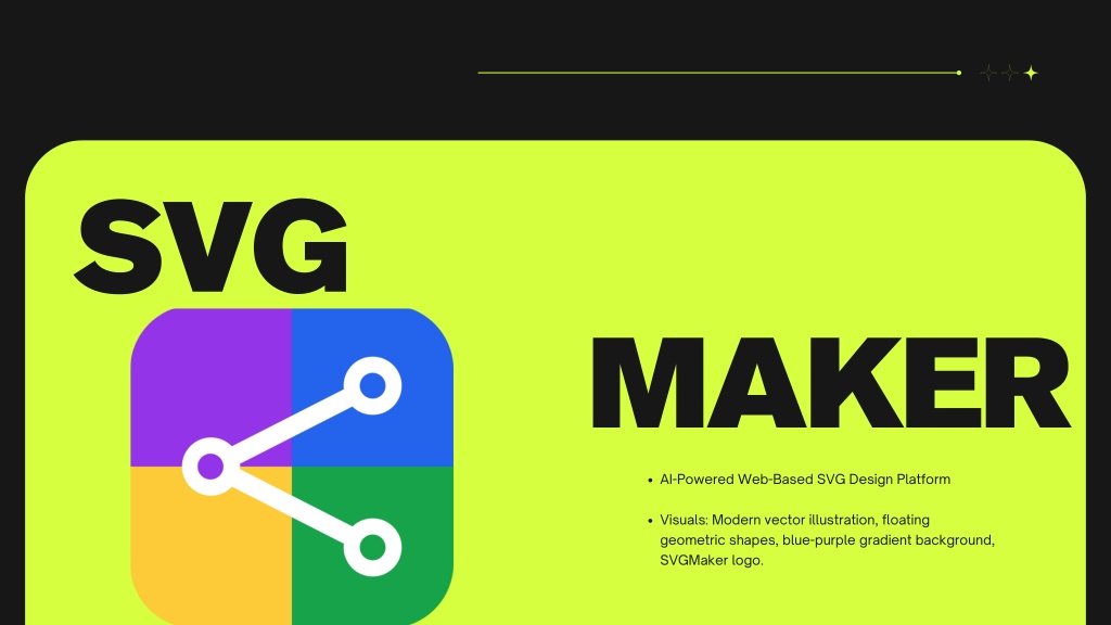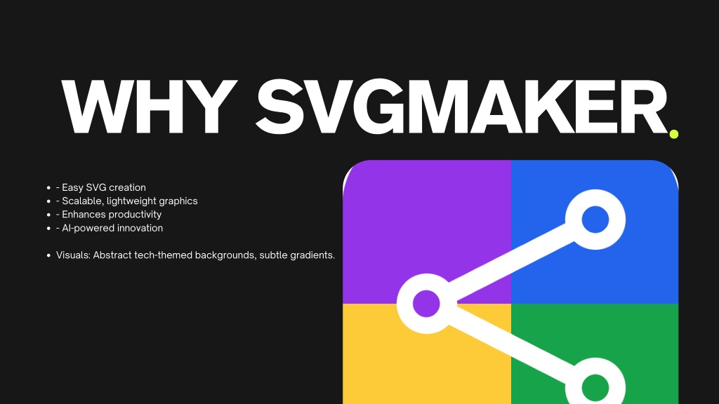 WHY SVGMAKER - Easy SVG creation - Scalable, lightweight graphics - Enhances productivity - AI-powered innovation Visuals: Abstract tech-themed backgrounds, subtle gradients.