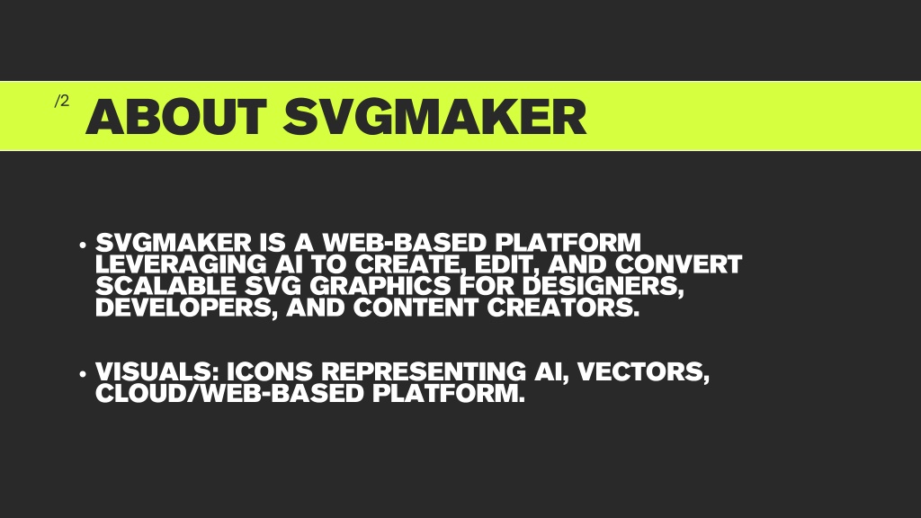 /2 ABOUT SVGMAKER SVGMAKER IS A WEB-BASED PLATFORM LEVERAGING AI TO CREATE, EDIT, AND CONVERT SCALABLE SVG GRAPHICS FOR DESIGNERS, DEVELOPERS, AND CONTENT CREATORS. VISUALS: ICONS REPRESENTING AI, VECTORS, CLOUD/WEB-BASED PLATFORM.