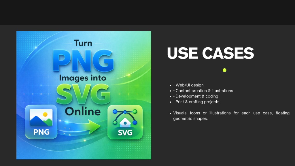USE CASES - Web/UI design - Content creation & illustrations - Development & coding - Print & crafting projects Visuals: Icons or illustrations for each use case, floating geometric shapes.