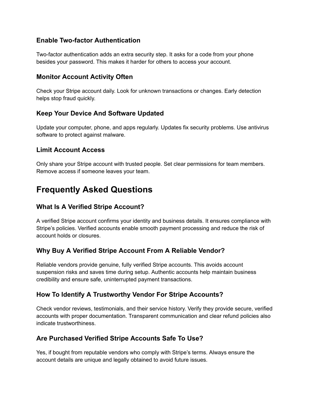 Enable Two-factor Authentication Two-factor authentication adds an extra security step. It asks for a code from your phone besides your password. This makes it harder for others to access your account. Monitor Account Activity Often Check your Stripe account daily. Look for unknown transactions or changes. Early detection helps stop fraud quickly. Keep Your Device And Software Updated Update your computer, phone, and apps regularly. Updates fix security problems. Use antivirus software to protect against malware. Limit Account Access Only share your Stripe account with trusted people. Set clear permissions for team members. Remove access if someone leaves your team. Frequently Asked Questions What Is A Verified Stripe Account? A verified Stripe account confirms your identity and business details. It ensures compliance with Stripe’s policies. Verified accounts enable smooth payment processing and reduce the risk of account holds or closures. Why Buy A Verified Stripe Account From A Reliable Vendor? Reliable vendors provide genuine, fully verified Stripe accounts. This avoids account suspension risks and saves time during setup. Authentic accounts help maintain business credibility and ensure safe, uninterrupted payment transactions. How To Identify A Trustworthy Vendor For Stripe Accounts? Check vendor reviews, testimonials, and their service history. Verify they provide secure, verified accounts with proper documentation. Transparent communication and clear refund policies also indicate trustworthiness. Are Purchased Verified Stripe Accounts Safe To Use? Yes, if bought from reputable vendors who comply with Stripe’s terms. Always ensure the account details are unique and legally obtained to avoid future issues.