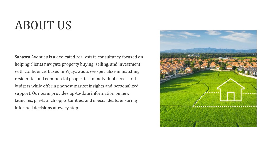 ABOUT US Sahasra Avenues is a dedicated real estate consultancy focused on helping clients navigate property buying, selling, and investment with confidence. Based in Vijayawada, we specialize in matching residential and commercial properties to individual needs and budgets while offering honest market insights and personalized support. Our team provides up-to-date information on new launches, pre-launch opportunities, and special deals, ensuring informed decisions at every step.