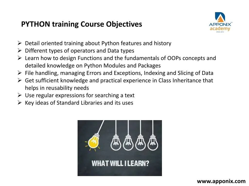 Detail oriented training about Python features and history • Different types of operators and Data types • Learn how to design Functions and the fundamentals of OOPs concepts and detailed knowledge on Python Modules and Packages • File handling, managing Errors and Exceptions, Indexing and Slicing of Data • Get sufficient knowledge and practical experience in Class Inheritance that helps in reusability needs • Use regular expressions for searching a text • Key ideas of Standard Libraries and its uses PYTHON training Course Objectives www.apponix.com