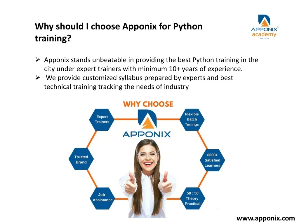 Apponix stands unbeatable in providing the best Python training in the city under expert trainers with minimum 10+ years of experience. • We provide customized syllabus prepared by experts and best technical training tracking the needs of industry Why should I choose Apponix for Python training? www.apponix.com