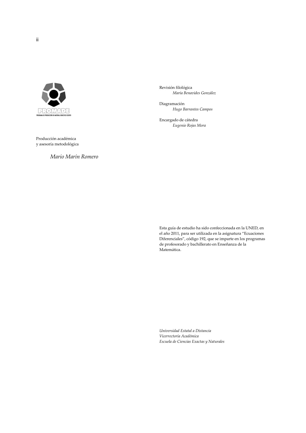 ii Revisión filológica María Benavides González Diagramación Hugo Barrantes Campos Encargado de cátedra Eugenio Rojas Mora Esta guía de estudio ha sido confeccionada en la UNED, en el año 2011, para ser utilizada en la asignatura “Ecuaciones Diferenciales”, código 192, que se imparte en los programas de profesorado y bachillerato en Enseñanza de la Matemática. Universidad Estatal a Distancia Vicerrectoría Académica Escuela de Ciencias Exactas y Naturales Producción académica y asesoría metodológica Mario Marín Romero