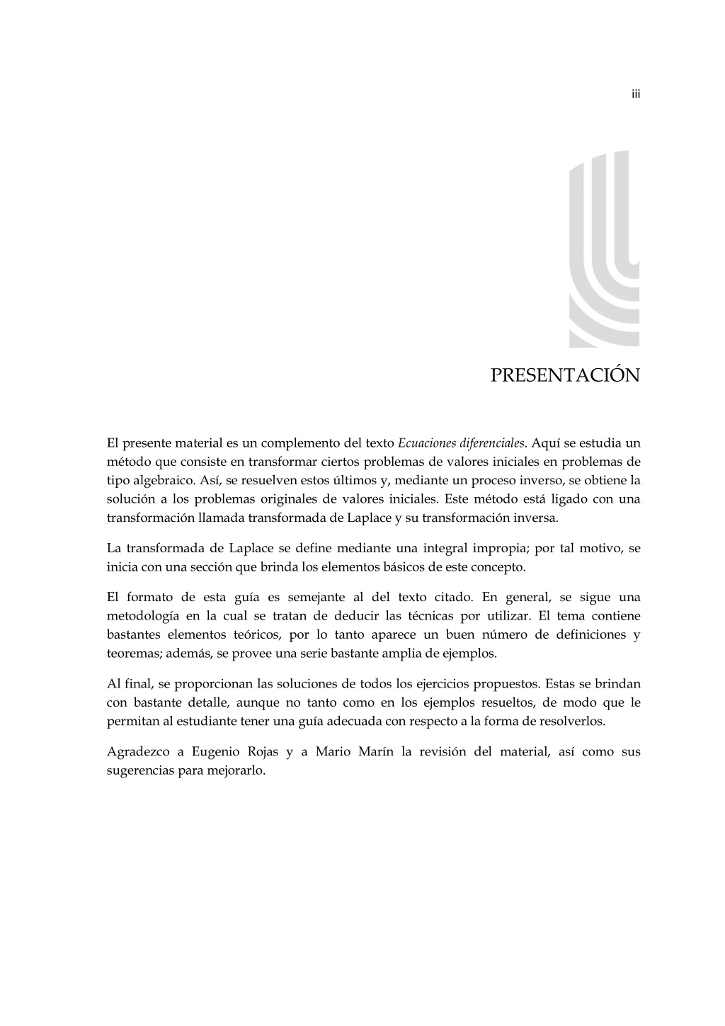 iii PRESENTACIÓN El presente material es un complemento del texto Ecuaciones diferenciales. Aquí se estudia un método que consiste en transformar ciertos problemas de valores iniciales en problemas de tipo algebraico. Así, se resuelven estos últimos y, mediante un proceso inverso, se obtiene la solución a los problemas originales de valores iniciales. Este método está ligado con una transformación llamada transformada de Laplace y su transformación inversa. La transformada de Laplace se define mediante una integral impropia; por tal motivo, se inicia con una sección que brinda los elementos básicos de este concepto. El formato de esta guía es semejante al del texto citado. En general, se sigue una metodología en la cual se tratan de deducir las técnicas por utilizar. El tema contiene bastantes elementos teóricos, por lo tanto aparece un buen número de definiciones y teoremas; además, se provee una serie bastante amplia de ejemplos. Al final, se proporcionan las soluciones de todos los ejercicios propuestos. Estas se brindan con bastante detalle, aunque no tanto como en los ejemplos resueltos, de modo que le permitan al estudiante tener una guía adecuada con respecto a la forma de resolverlos. Agradezco a Eugenio Rojas y a Mario Marín la revisión del material, así como sus sugerencias para mejorarlo.
