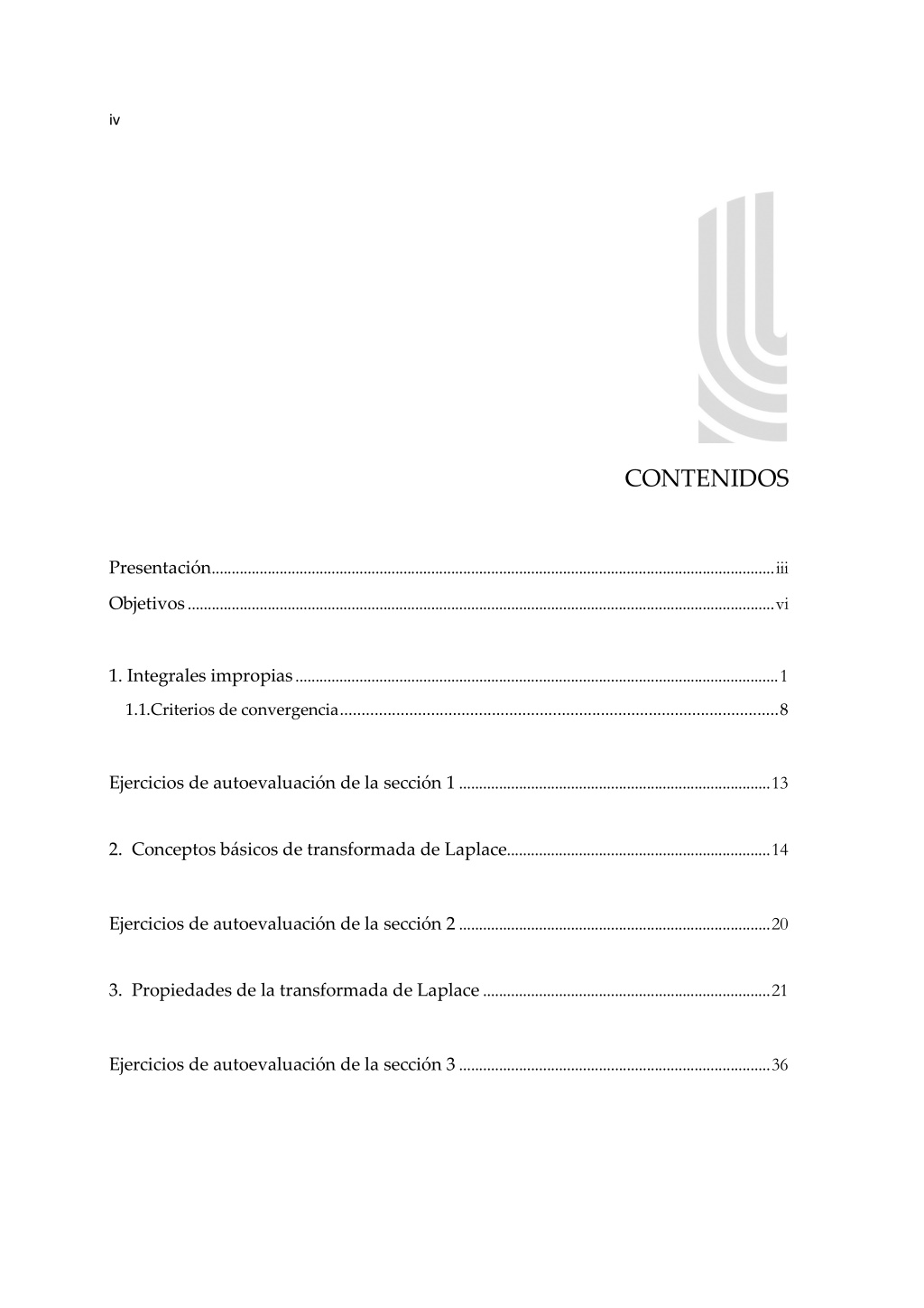 iv CONTENIDOS Presentación ............................................................................................................................................. iii Objetivos ................................................................................................................................................... vi 1. Integrales impropias ......................................................................................................................... 1 1.1.Criterios de convergencia ..................................................................................................... 8 Ejercicios de autoevaluación de la sección 1 .............................................................................. 13 2. Conceptos básicos de transformada de Laplace.................................................................. 14 Ejercicios de autoevaluación de la sección 2 .............................................................................. 20 3. Propiedades de la transformada de Laplace ........................................................................ 21 Ejercicios de autoevaluación de la sección 3 .............................................................................. 36