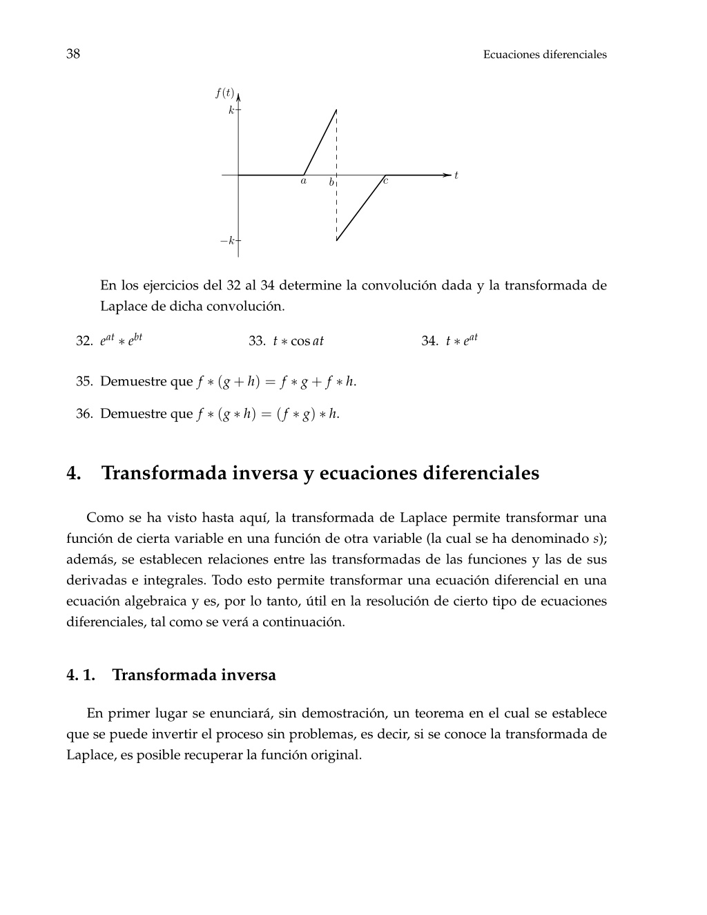 38 Ecuaciones diferenciales f(t) k t a c b −k En los ejercicios del 32 al 34 determine la convolución dada y la transformada de Laplace de dicha convolución. 32. eat∗ ebt 34. t ∗ eat 33. t ∗ cosat 35. Demuestre que f ∗ (g + h) = f ∗ g + f ∗ h. 36. Demuestre que f ∗ (g ∗ h) = (f ∗ g) ∗ h. 4. Transformada inversa y ecuaciones diferenciales Como se ha visto hasta aquí, la transformada de Laplace permite transformar una función de cierta variable en una función de otra variable (la cual se ha denominado s); además, se establecen relaciones entre las transformadas de las funciones y las de sus derivadas e integrales. Todo esto permite transformar una ecuación diferencial en una ecuación algebraica y es, por lo tanto, útil en la resolución de cierto tipo de ecuaciones diferenciales, tal como se verá a continuación. 4. 1. Transformada inversa En primer lugar se enunciará, sin demostración, un teorema en el cual se establece que se puede invertir el proceso sin problemas, es decir, si se conoce la transformada de Laplace, es posible recuperar la función original.