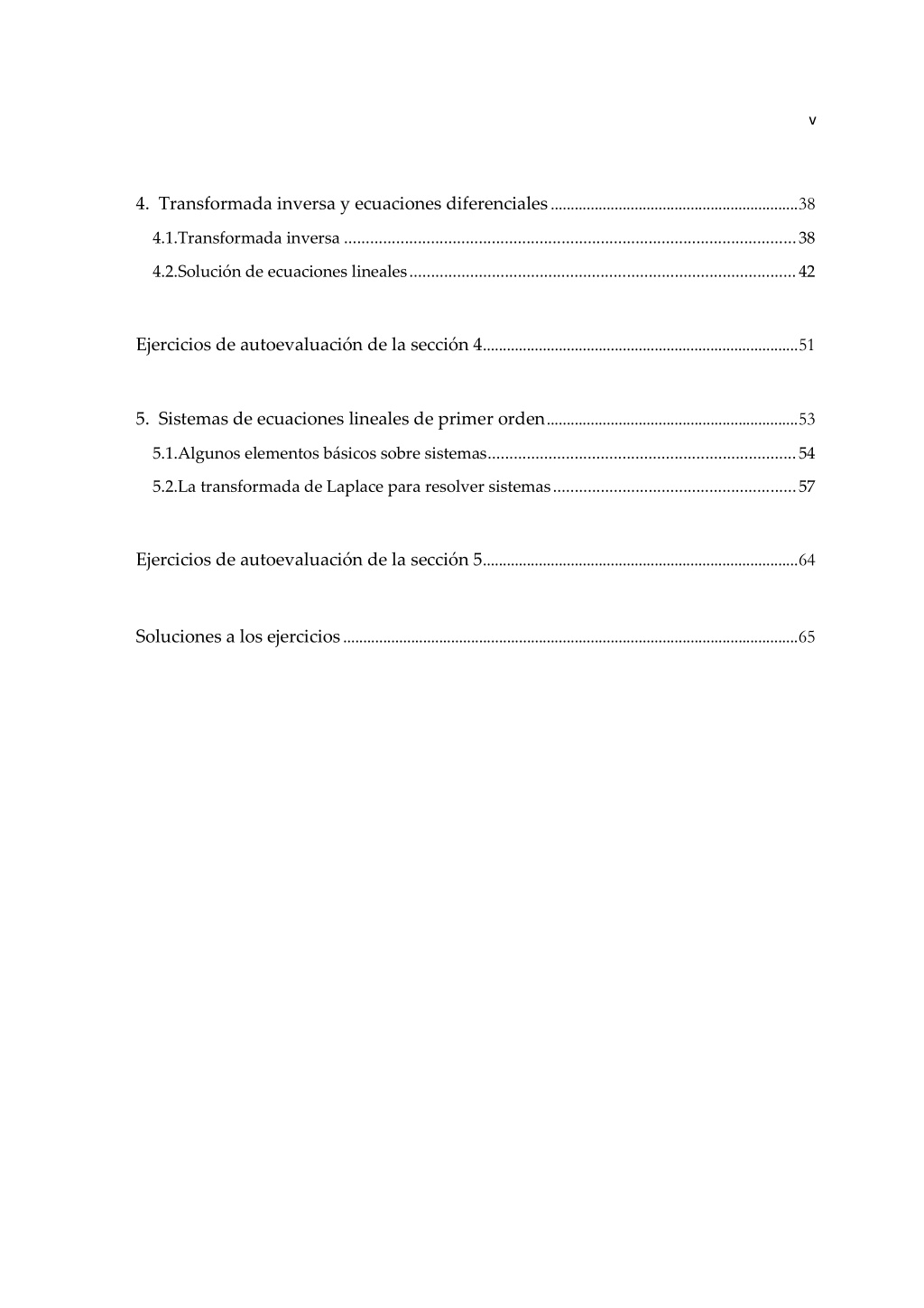 v 4. Transformada inversa y ecuaciones diferenciales .............................................................. 38 4.1.Transformada inversa ........................................................................................................ 38 4.2.Solución de ecuaciones lineales ......................................................................................... 42 Ejercicios de autoevaluación de la sección 4 ............................................................................... 51 5. Sistemas de ecuaciones lineales de primer orden ............................................................... 53 5.1.Algunos elementos básicos sobre sistemas ....................................................................... 54 5.2.La transformada de Laplace para resolver sistemas ........................................................ 57 Ejercicios de autoevaluación de la sección 5 ............................................................................... 64 Soluciones a los ejercicios .................................................................................................................. 65