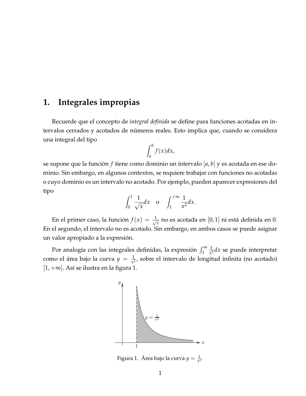 1. Integrales impropias Recuerde que el concepto de integral definida se define para funciones acotadas en in- tervalos cerrados y acotados de números reales. Esto implica que, cuando se considera una integral del tipo Zb se supone que la función f tiene como dominio un intervalo [a,b] y es acotada en ese do- minio. Sin embargo, en algunos contextos, se requiere trabajar con funciones no acotadas o cuyo dominio es un intervalo no acotado. Por ejemplo, pueden aparecer expresiones del tipo Z1 f(x)dx, a Z+∞ 1 1 x2dx. o √xdx 0 1 1 En el primer caso, la función f(x) = En el segundo, el intervalo no es acotado. Sin embargo, en ambos casos se puede asignar un valor apropiado a la expresión. Por analogía con las integrales definidas, la expresiónR∞ [1,+∞[. Así se ilustra en la figura 1. √xno es acotada en [0,1] ni está definida en 0. 1 x2dx se puede interpretar 1 1 x2, sobre el intervalo de longitud infinita (no acotado) como el área bajo la curva y = y 1 y = x2 x 1 1 x2. Figura 1. Área bajo la curva y = 1