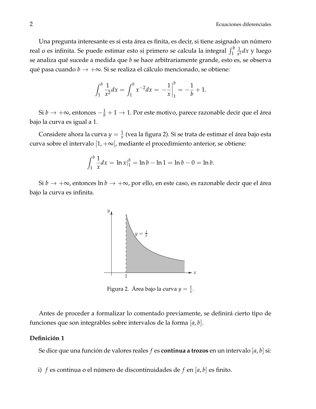 2 Ecuaciones diferenciales Una pregunta interesante es si esta área es finita, es decir, si tiene asignado un número real o es infinita. Se puede estimar esto si primero se calcula la integralRb qué pasa cuando b → +∞. Si se realiza el cálculo mencionado, se obtiene: Zb 1 x2dx y luego 1 se analiza qué sucede a medida que b se hace arbitrariamente grande, esto es, se observa ???? Zb b 1 x2dx = x−2dx = −1 = −1 b+ 1. x 1 1 1 Si b → +∞, entonces −1 bajo la curva es igual a 1. b+ 1 → 1. Por este motivo, parece razonable decir que el área Considere ahora la curva y =1 curva sobre el intervalo [1,+∞[, mediante el procedimiento anterior, se obtiene: x(vea la figura 2). Si se trata de estimar el área bajo esta Zb 1 xdx = lnx|b 1= lnb − ln1 = lnb − 0 = lnb. 1 Si b → +∞, entonces lnb → +∞, por ello, en este caso, es razonable decir que el área bajo la curva es infinita. y y =1 x x 1 Figura 2. Área bajo la curva y =1 x. Antes de proceder a formalizar lo comentado previamente, se definirá cierto tipo de funciones que son integrables sobre intervalos de la forma [a,b]. Definición 1 Sedicequeunafuncióndevaloresreales f escontinuaatrozosenunintervalo [a,b] si: i) f es continua o el número de discontinuidades de f en [a,b] es finito.