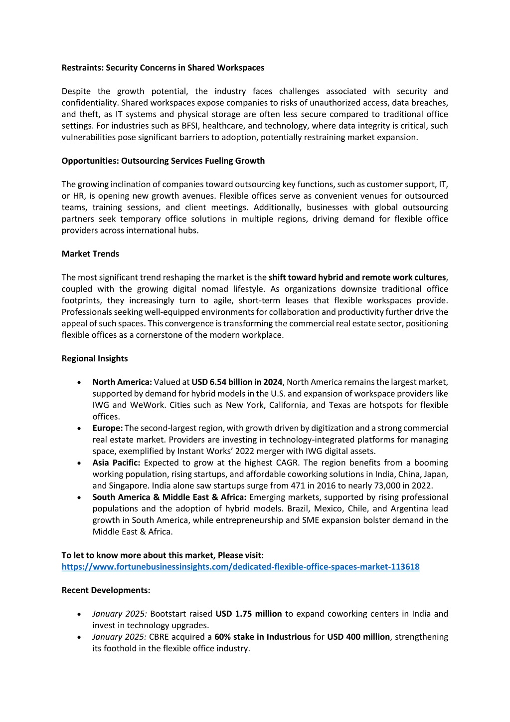 Restraints: Security Concerns in Shared Workspaces Despite the growth potential, the industry faces challenges associated with security and confidentiality. Shared workspaces expose companies to risks of unauthorized access, data breaches, and theft, as IT systems and physical storage are often less secure compared to traditional office settings. For industries such as BFSI, healthcare, and technology, where data integrity is critical, such vulnerabilities pose significant barriers to adoption, potentially restraining market expansion. Opportunities: Outsourcing Services Fueling Growth The growing inclination of companies toward outsourcing key functions, such as customer support, IT, or HR, is opening new growth avenues. Flexible offices serve as convenient venues for outsourced teams, training sessions, and client meetings. Additionally, businesses with global outsourcing partners seek temporary office solutions in multiple regions, driving demand for flexible office providers across international hubs. Market Trends The most significant trend reshaping the market is the shift toward hybrid and remote work cultures, coupled with the growing digital nomad lifestyle. As organizations downsize traditional office footprints, they increasingly turn to agile, short-term leases that flexible workspaces provide. Professionals seeking well-equipped environments for collaboration and productivity further drive the appeal of such spaces. This convergence is transforming the commercial real estate sector, positioning flexible offices as a cornerstone of the modern workplace. Regional Insights North America: Valued at USD 6.54 billion in 2024, North America remains the largest market, supported by demand for hybrid models in the U.S. and expansion of workspace providers like IWG and WeWork. Cities such as New York, California, and Texas are hotspots for flexible offices. Europe: The second-largest region, with growth driven by digitization and a strong commercial real estate market. Providers are investing in technology-integrated platforms for managing space, exemplified by Instant Works’ 2022 merger with IWG digital assets. Asia Pacific: Expected to grow at the highest CAGR. The region benefits from a booming working population, rising startups, and affordable coworking solutions in India, China, Japan, and Singapore. India alone saw startups surge from 471 in 2016 to nearly 73,000 in 2022. South America & Middle East & Africa: Emerging markets, supported by rising professional populations and the adoption of hybrid models. Brazil, Mexico, Chile, and Argentina lead growth in South America, while entrepreneurship and SME expansion bolster demand in the Middle East & Africa. To let to know more about this market, Please visit: https://www.fortunebusinessinsights.com/dedicated-flexible-office-spaces-market-113618 Recent Developments: January 2025: Bootstart raised USD 1.75 million to expand coworking centers in India and invest in technology upgrades. January 2025: CBRE acquired a 60% stake in Industrious for USD 400 million, strengthening its foothold in the flexible office industry.